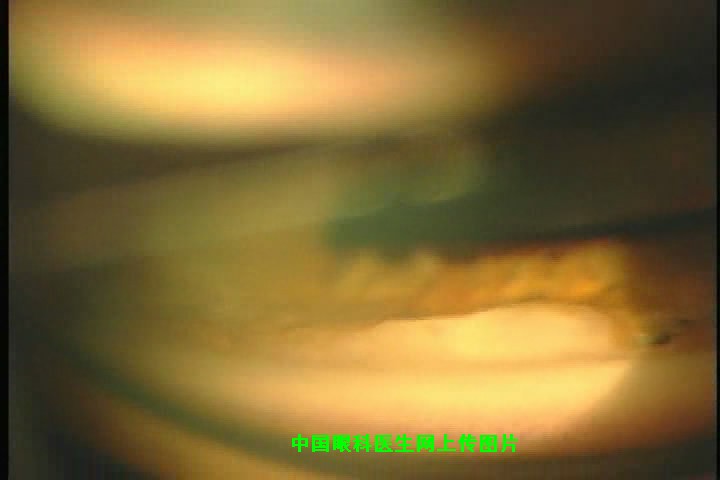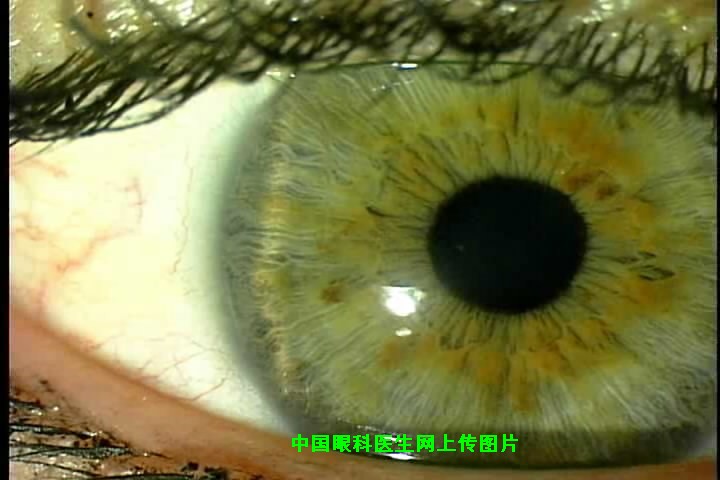 虹膜囊肿 (by 杨治坤大夫,错误之处敬请谅解): 这是一名青年女性,在常规检查中发现右眼颞侧虹膜较饱满。裂隙灯下眼部大致正常,但在裂隙光带下部分虹膜显饱满,这一点需要仔细观察,此外这名患者还有角膜后胚胎环。观察虹膜表面的裂隙光带,就可以清楚地体会这种饱满感。虹膜表面是完全正常的,因此我们就怀疑在虹膜后存在一些异常的结构。在房角镜下就可以更清晰的观察到,在虹膜周边的这种饱满感。实际上虹膜表面的结构并未改变,这是虹膜色素上皮囊肿的典型表现。通过虹膜透光检查可以发现,但在B超上更清楚,显示为充满液体的囊腔。这里就是这名患者的B超图。虹膜囊肿是一种良性病变,可以进行长期随诊而不需进行干预。