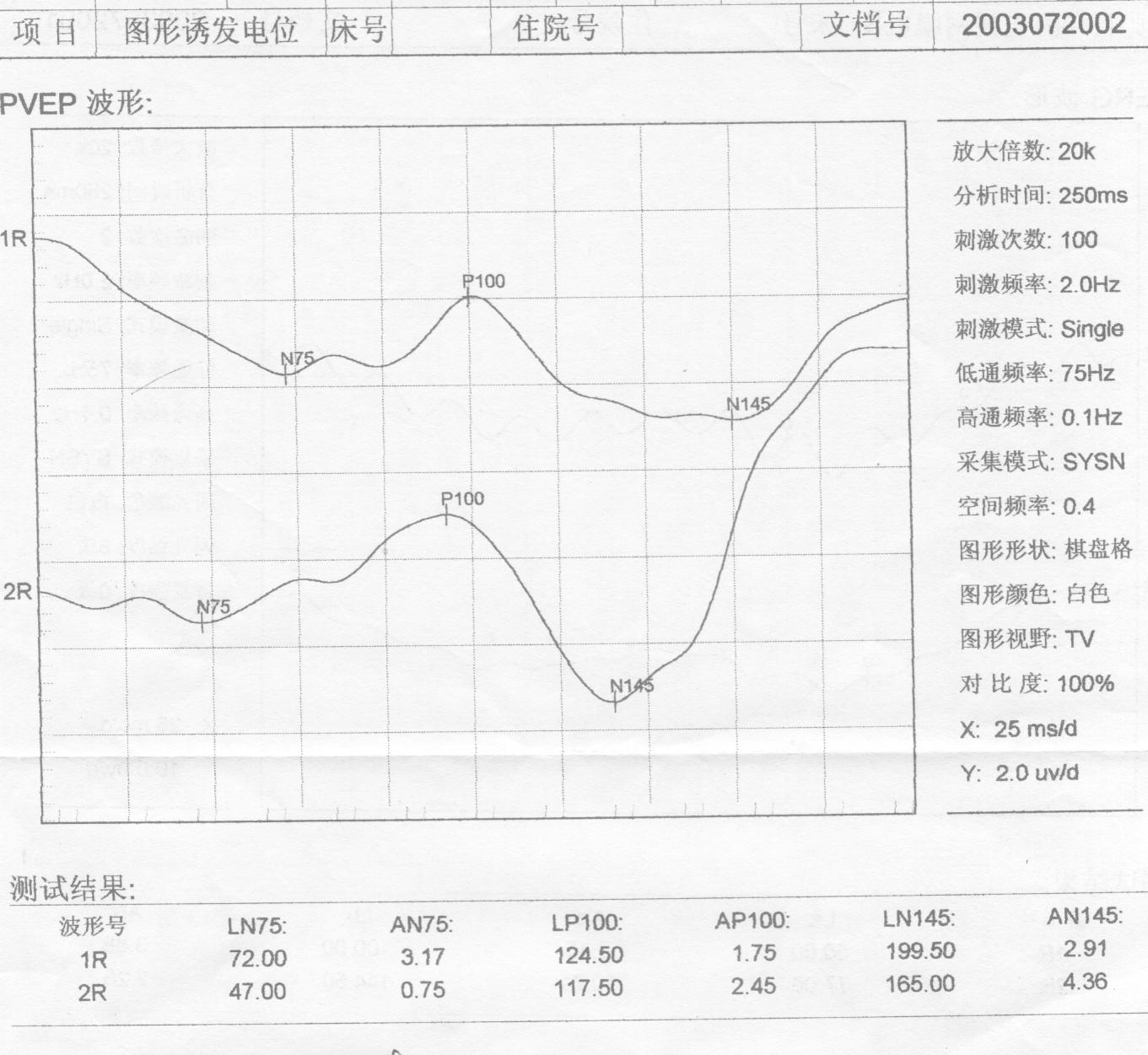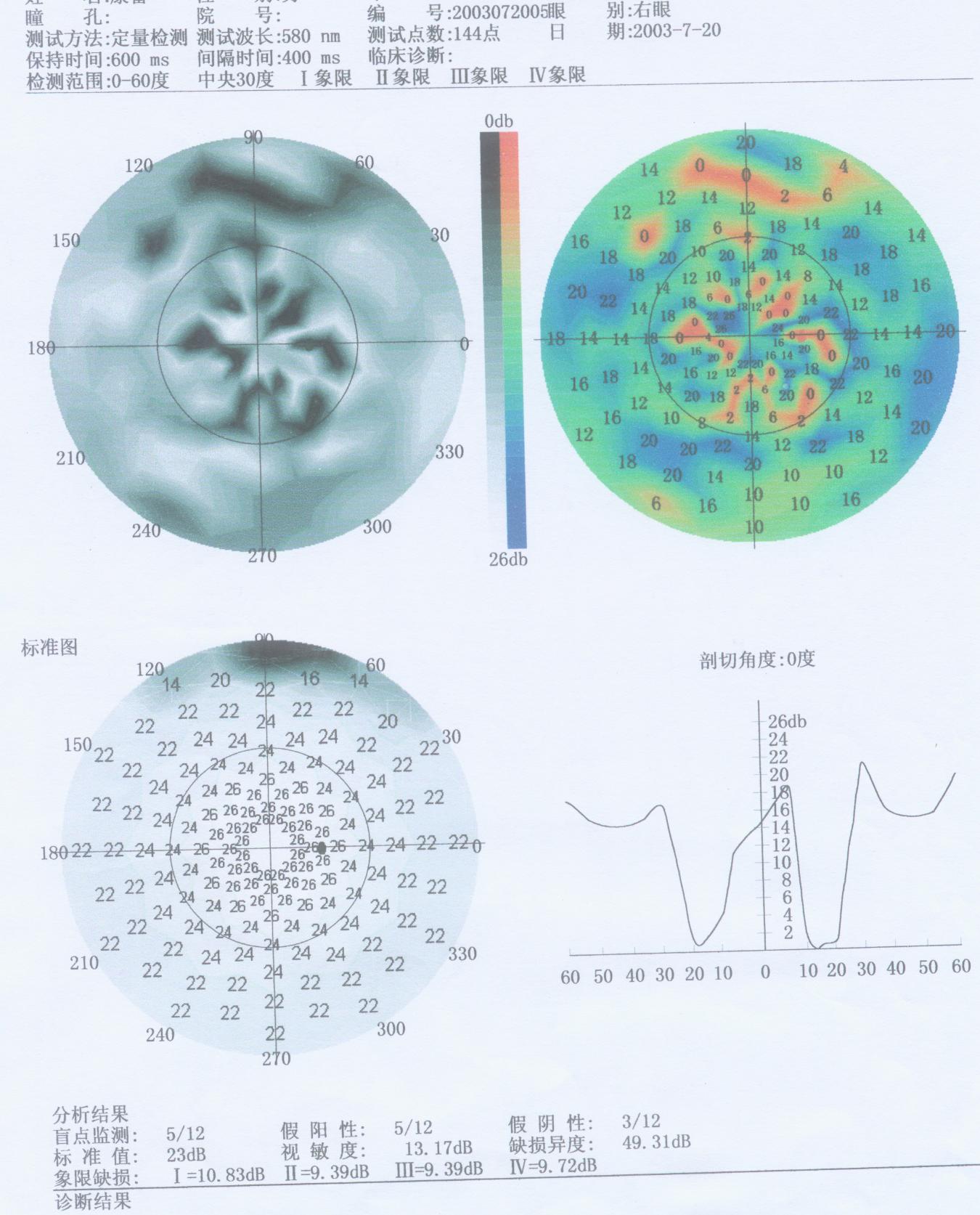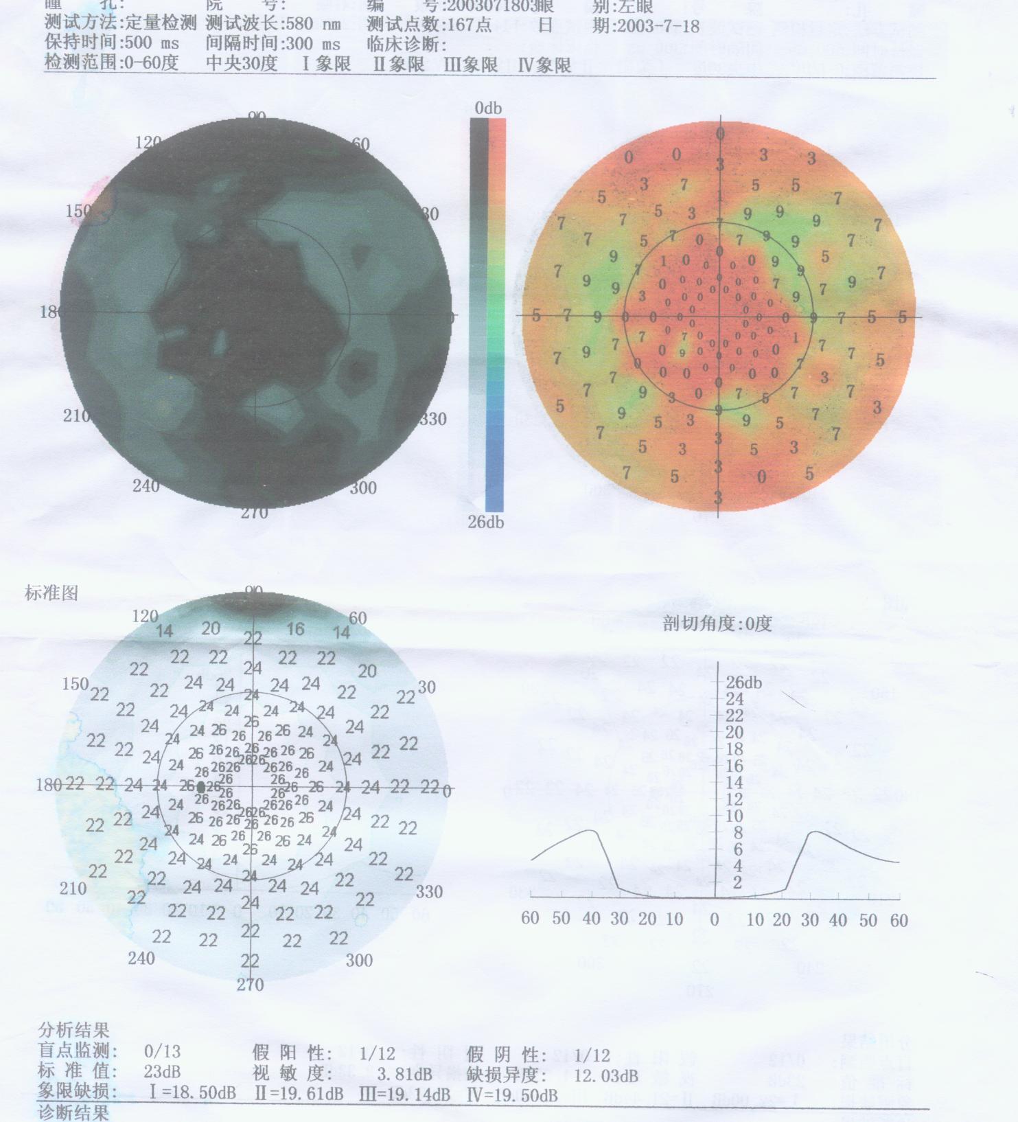 电生理及视野 色觉图谱认图:只能分出第一张数字,余皆不能辨出.