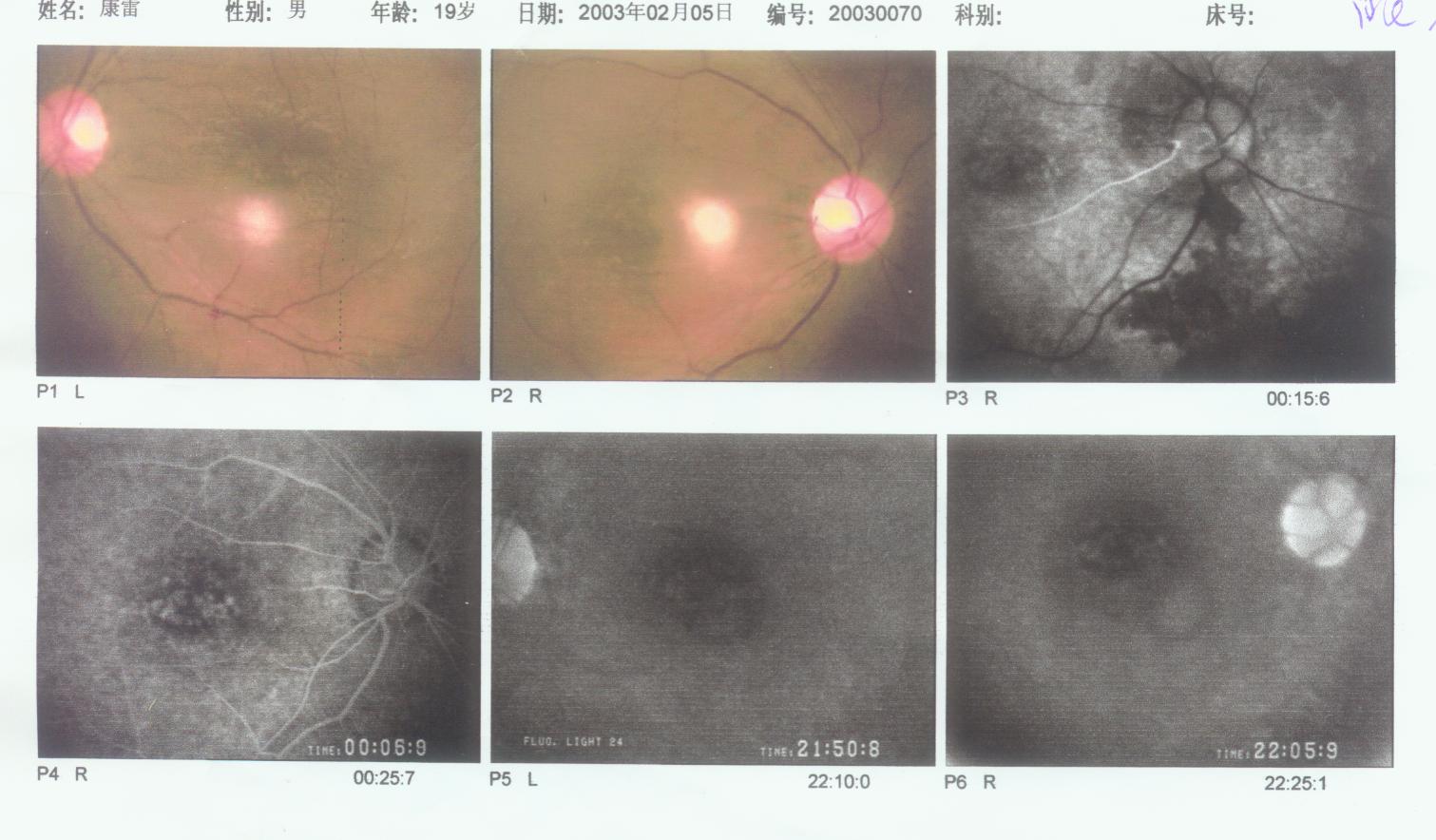 林某,男,19岁,学生,汉, 主诉: 夜间礼物不见伴双眼视力逐渐下降5月余 5月前,于学校晨起(约6点钟左右)早操时,发现双眼视物不见.遂到当地眼科就诊.诊为"双眼夜盲证",给以VAD丸 2丸 口服 日三次,施图伦眼液点双眼日三次,及输液药物治疗(所输药物及剂量不详).至今未见好转,遂来我院就诊.于7月18号10点门诊以"双眼黄斑病变"收入院.