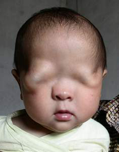小飞出生时发现无睑裂,身体的其他器官发育也很健康,与同龄婴儿别无二致。右眼球部位长有约3厘米见方的肉包,左眼球部位的肉包略小一些。刚生下来时,两个肉包包还不怎么明显,但是时间一长,小飞眼球周围的肉包包越来越大。对光线特别敏感,稍稍有一点太阳光的照射,他都会情不自禁地把脸背过去,或是用小手遮挡。
