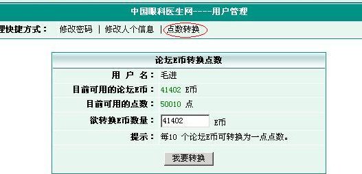 在用户管理界面的右侧顶端可以看到“点数转换”的链接,点击后出现如图所示的转换界面,即可将论坛货币转为为网站点数(注意:网站点数不能转换为论坛货币!!)