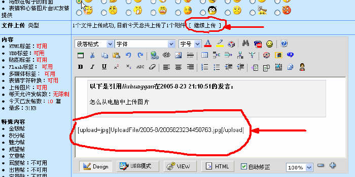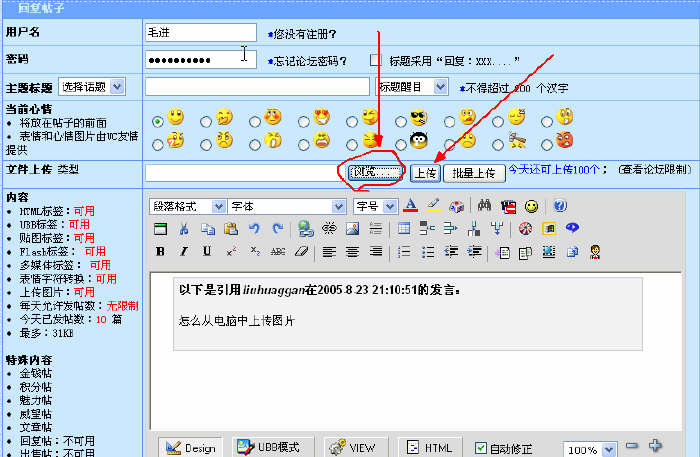 过程:点击发新贴或者帖子右上方的回复(非下方的快速回复)均可以见到如下图所示的文件上传框,点击浏览,选择本地硬盘中的图片或者文件(支持jpg、gif、bmp、rar、zip等格式)。然后点击“上传”