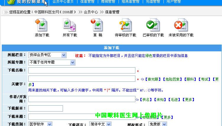 5、(1)如果分享的资源文件小于1M,就可以在“上传下载”中选择浏览,找到本地资源的文件,确认其小于1M,点击上传后直接上传。本站支持直接上传的文件格式有图形格式(bmp,jpg),压缩格式(zip,winrar)。请在上传前整理成本站所支持的格式。(2)如果分享文件超过1M,请通过网站或者论坛短消息联系“毛进。由站长告诉发贴者本站FTP软件下载(绿色软件,约300K,包括了上传的用户名和密码)。下载后即可上传相关资源(请自己建目录并命名相应的文件和上传相关说明的文本文件)。上传结束后email或短消息告诉我。然后在“下载地址”中选择“添加外部地址”,在弹出的窗口中填入“下载地址|http://www.oculist.net/soft/你上传文件的名字”,然后确认即可。