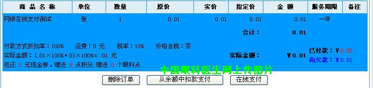 (1)通过在线支付可以最快完成交易,获得说需要的眼科宝贝。例如网站充值卡,在线支付完成的同时就可以在“用户控制面板”的商城中获得充值卡的卡号和密码用于本站眼科点的充值,以便进行相应资源的查看和下载。