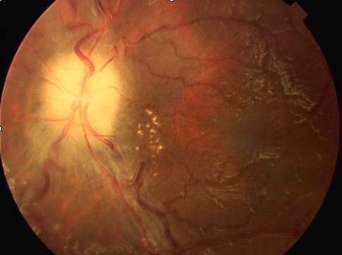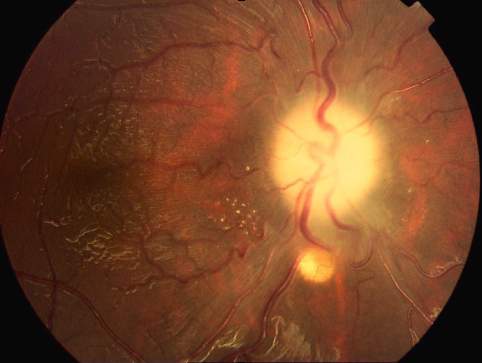 眼底图: 患者双眼底相。双视乳头色白,轻度隆起,边界欠清,视网膜静脉迂曲扩张,视网膜下渗出,后极部视网膜轻度水肿。