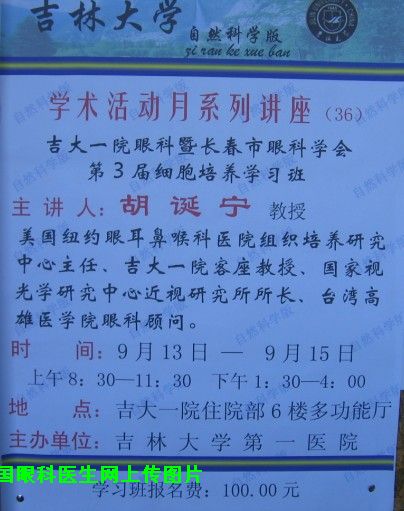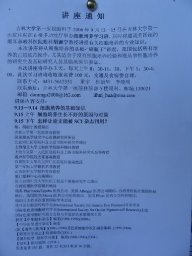 吉林大学第一医院眼科将于2006-9-13到2006年9月15日在吉林大学第一医院住院部6楼多功能厅举办细胞培养学习班,届时将邀请美国纽约眼耳鼻喉科医院眼科胡诞宁教授讲授有关细胞培养的专业知识。