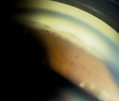 1999年至今多次眼压检查双眼均在16~20mmHg水平。期间患者间断使用素高捷疗、人工泪液。 2002年4月16日患者来诊。查:双颧面及四肢未见异常。VOD 1.2, OS 0.9(戴镜)。Pa:右20mmHg,左18mmHg。双上睑结膜少许瘢痕。角膜清澈。右颞侧角膜缘后弹力层沿Schwalbe线区域白线样结构。双前房等深,右颞侧周边前房明显浅于左侧。约1/4CT,左约21/2~1/3CT。双虹膜纹清,瞳孔缘区尚平伏,右颞侧周边轻膨隆。小瞳孔下:双晶体密度略高,视乳头色红界清,C/D 双0.7。双颞下盘沿窄,切迹明显。 房角镜检查:散瞳前:右360度Schwalbe线突出,颞侧为著。其上可见残存粘连之虹膜组织。虹膜根部起伏不平,其上可见环形印迹和点状隆起,与隆起的Schwalbe线有松弛的粘连。滤帘可见色素,睫状体带及房角隐窝可见入射角15~20度。左眼Schwalbe线轻度突出。,其上亦可见少许残存粘连之虹膜组织。虹膜根部轻度点状隆起。Schlemm管充血。散瞳后:右眼上方部分房角关闭。Schwalbe线与虹膜根部附着范围扩大。360度房角进一步变窄。诊断:Axenfeld综合症。
