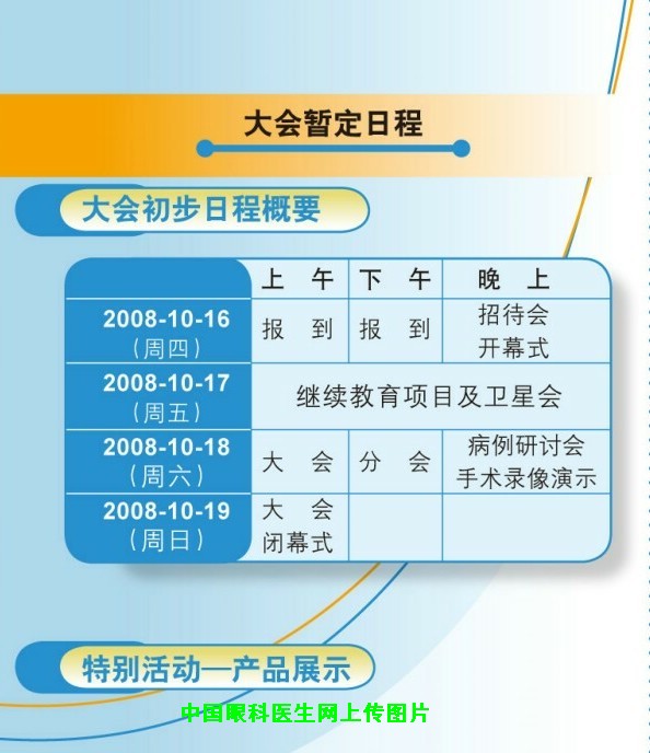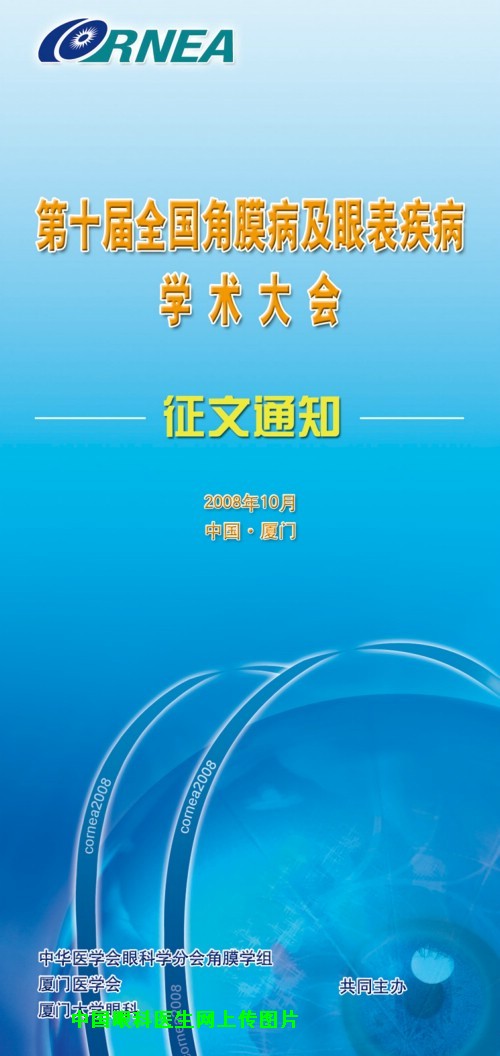经中华医学会眼科学分会批准,第十届全国角膜病及眼表疾病学术大会将于 2008 年 10月 中下旬在福建省厦门市举行,中华医学会眼科学分会角膜学组、厦门市医学会及厦门大学眼科研究所及附属厦门眼科中心诚邀国内外眼科专家与同道,以及眼科企业界人士踊跃出席大会。