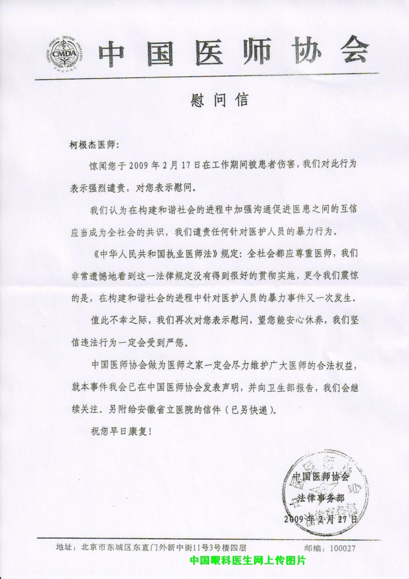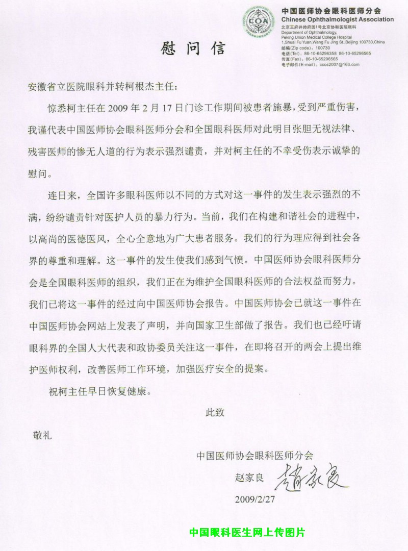 中国医师协会对柯主任受伤事件的慰问