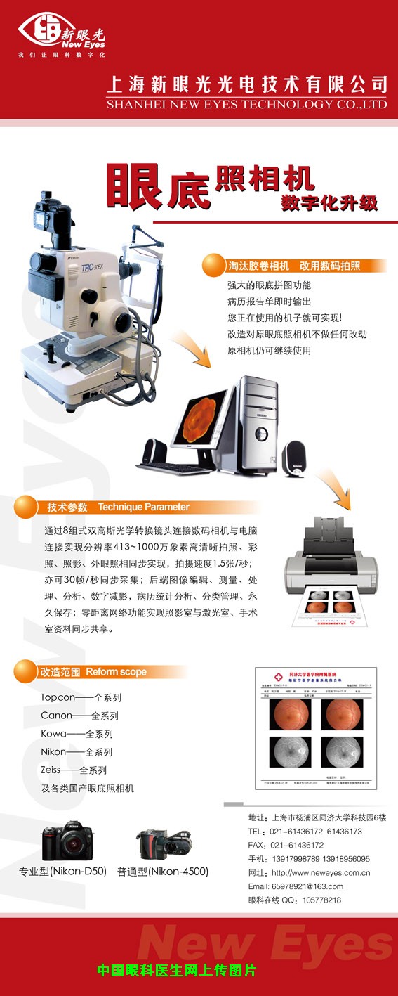 眼底照相机数字化升级——由上海复旦大学医学院著名教授组织开发的科研成果。并以上海复旦大学附属中山医院作为临床的科研单位,是国内最早研发本系统的公司,经过多年研究攻克在老式眼底照相机上成功实现了数码成像,淘汰了原烦琐胶卷方式。在科研推广过程中总结各地医院反馈,在原有基础上不断提升、完善,成像清晰度更高,功能更强大,实现患者信息资料与图象的高效存储、管理、传输与共享,升级范围扩大至TopconNikonKowaCanonZeiss等全系列仪器。
