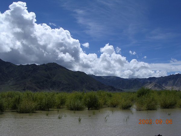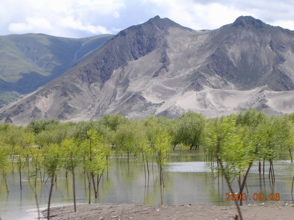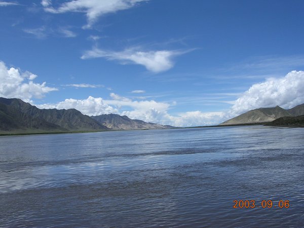 早上10点我们沿着机场路出发了,机场路是沿雅鲁藏布江一路东行,刚到西藏时因为要保存体力,所以没有太留意江边的景色,今天天气晴朗,心情舒畅,因此看着江边的景色格外美丽。雅鲁藏布江时而宽阔平静,时而奔流湍急。江边的树林因时至中秋而显得金黄一片,可惜不能时时停留下来记录下这美丽的风景。江边的群山巍峨绵延,最为奇特的是在山脚还常常见到美丽的沙丘和沙滩,询问同行的藏族司机,答复是因为风将沙吹到山脚形成的,但窃疑为过去江岸高至山脚以致形成江沙堆砌的沙丘。大片的沙丘让你感觉到来荒芜的沙漠,可是不远处迤逦绵延的绿色群山和奔流的大江又让我感觉回到了美丽的江南。真是奇特美丽的风景,将荒凉的沙漠和富饶的绿洲有机的结合到一切。可惜我的傻瓜相机和贫乏的审美构图能力不能将这美丽的风景记录下来。最后我们在一处宽广美丽的沙丘面前停了下来,我们下车后禁不住欢呼雀跃,这么美丽的地方居然只有我们同行的几个人和一头悠闲的牦牛!我们飞快得冲进沙丘,踩在细腻绵软的沙面上,恍惚是在美丽的海滨,又是在粗旷的沙漠。如此良辰美景很快变成了"Films Killer"和"Disk Killer",我们手中相机的快门不停的闪动,希望胶片或者CCD能为我们留下这终生难忘的记忆。看着高高的沙丘和斜坡,心情变得格外的亢奋。我完全忘记了自己身处高原,完全可能因为剧烈运动导致严重的缺氧。我飞快地攀上沙丘的顶峰向他们欢呼,然后顺着沙丘滑下,坐在细腻的沙面上滑动的感觉真好。回头看看平整而近似完美的沙面上留下了自己的痕迹,心中产生了一些莫名的感悟和惶恐。我们一行四人在沙面上留下自己名字的缩写并留影纪念(幸好我们的"到此一游"会很快被美丽的江风抹平,不然我们几个都成了破坏自然的罪人)。逗留了近一个小时后考虑到后面的行程我们依依不舍的离开了雅鲁藏布江边上这片美丽的"沙漠"。