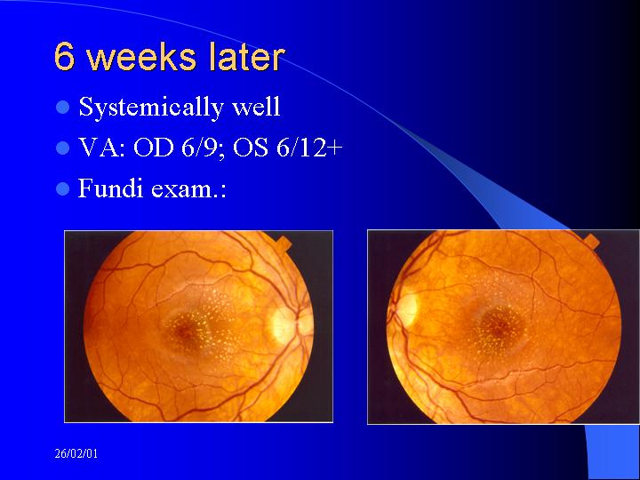 Further History about this child: K.R.’s family has 2 cats and 3 kittens She had close contact the cats and kittens prior to her illness No recall of being scratched by cat, or kittens Diagnosis ? Serum Bartonella Henselae titre( IgG 1024) highly positive. Bilateral Neuroretinitis associated with Cat Scratch Disease Treatment ? Discharge & discontinued all medications Ophthalmology R/V 4 weeks later AKH 6 weeks later Systemically well VA: OD 6/9; OS 6/12+ Fundi exam.: Any changes in the discs & macula ? Discussion Leber’s Idiopathic Stellate Neuroretinitis. 1916. Unilateral Stellate macular exudates Unknown etiology Spontaneous resolution Dreyer et al 1984; modified the terminology of LISN, suggesting a heterogeneous group of conditions can cause similar clinical pictures. He also pointed out that it can be bilateral.many of Leber’s cases may indeed caused by CSD. Discussion ( cont.) Secondary causes of Neuroretinitis: Viral:hepatitis B,HSV,HZV,EBV influenza Bacterial:Bartonella(CSD),TB,Syphilis,lyme disease Fungi:histoplasmosis Parasites & protozoa: toxoplasmosis Others: sarcoidosis, Behcets disease Most common: Cat scratch disease Toxoplasmosis Syphilis Lyme disease Neuroretinitis & CSD Wear et al. 1983, indicated the causative agent of CSD being Gram –ve Bacilli Sweeney and Drance.1990 first described Neuroretinitis caused by CSD Regenry et al. 1992, found high antibody titres (>1:64) to Bartonella henselae in 36 of 41 patients with CSD Serologic evidence of CSD in Neuroretinitis 64.3% (Eric Suhler, Ophthalmology vol 107,No5 2000) Ocular manifestations of CSD Parinaud’s oculoglandular syndrome Fever Granulomatous conjunctivitis Regional lymphadenopathy Neuroretinitis Loss of vision. 6/9 to PL Disc swelling Macular star Focal infarct Often unilateral, but can be bilateral Ocular manifestations of CSD Optic neuritis/papillitis Uveitic syndromes Vitritis Acute multifocal inner retinitis,or retinal white dot syndrome Retinitis Choroiditis Ocular manifestations of CSD Retinovascular syndromes BRVO,BRAO Retinal vasculitis Peripapillary angiomatosis Others. Vf defects, ocular motor palsy Ocular features of AIDS-associated CSD Bacillary angiomatosis in conj & retina
