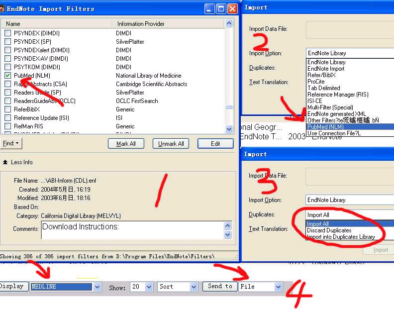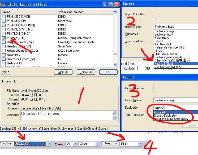 2 导入:首先打开你要导入的目标数据库,然后File-->Import,会出现导入窗口。点choose file选择我们保存的结果文件。在import option(窗口2)里面选择我们使用的数据库,这里我选择pubmed。(从这里还可以看出,endnote也可以导入reference manager和procite的数据,毕竟都是isi一家人么 )。在Duplicates(窗口3)里面选择import all是全部导入(与原有数据库重复的文献也导入),discard duplicates是不导入与原有文献重复的文献,import into duplicates library是把重复的文献导入到另外一个数据库中。