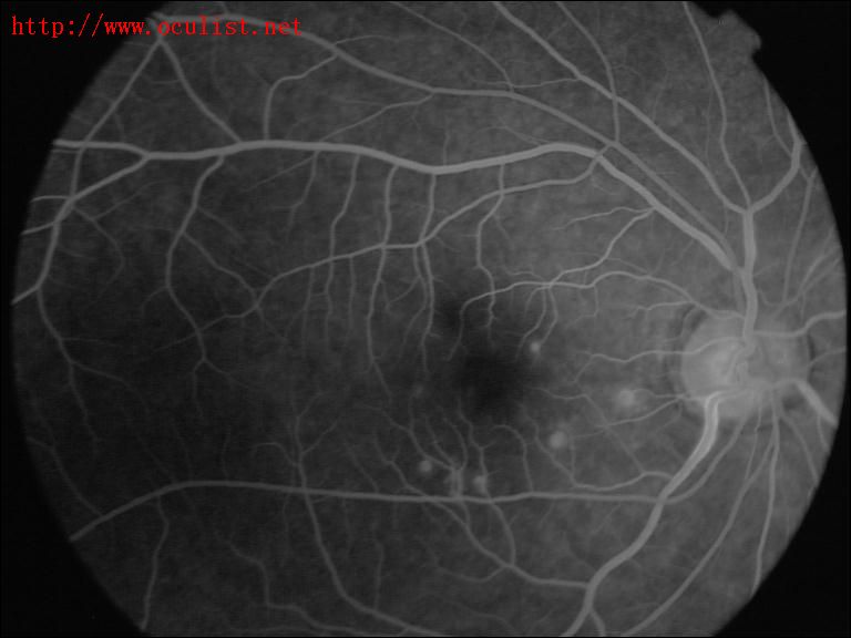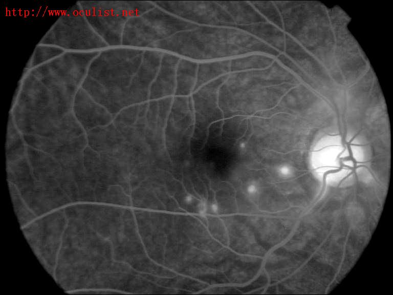 患者双眼视力VD0.04, VS0.08, 眼底检查可见黄斑区数个黄色圆点状视网膜色素上皮 (RPE)病变,(图1)2003年9月17日用日本拓普康数字化处理系统造影机做眼底血管造影,FA显示右眼黄斑鼻侧及下侧早期可见数个颗粒状低荧光,随时间延长,荧光增强,晚期呈强荧光,但并无荧光渗漏,未见 (CNV),经改善微循环,营养视网膜治疗,2月后患者逐渐恢复,双眼视力一直保持稳定,视力VD0.06, VS0.08,矫正视力VD0.8, VS0.8。
