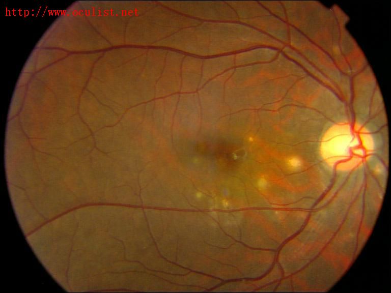 一位女患者,28岁,高度近视(双眼- 7.0D),2003年5月份发病,主诉右眼前黑影,伴视力下降,到同仁医院就诊,诊断为APMPPE,治疗经过不详,一月后视力逐渐恢复,9月份旧病复发来我院就诊。