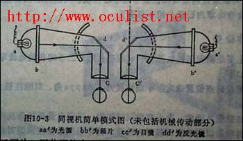 •镜筒内装有一个平面反光镜,与视线呈45度角,这样能够使两只镜筒分别向左右两个方向弯曲90度。筒的一端装有目镜,另一端装有画片,中间安放一只正7个屈光度的球镜,使画片置于球镜的焦点上。病人经目镜看到的画片好象来自无限远,其光线是平行的。