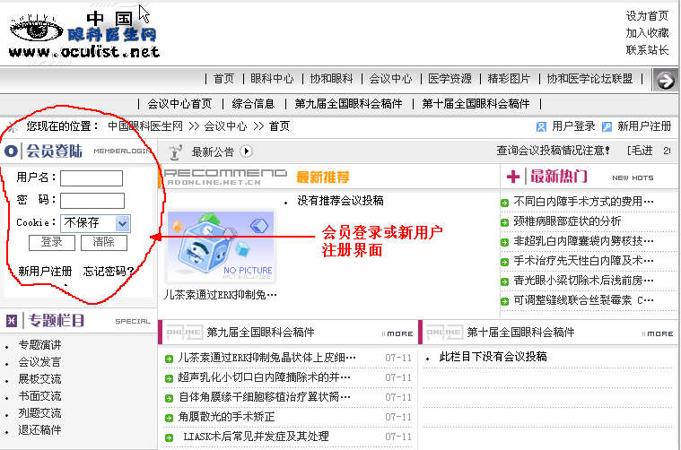 第一步:登录本站或者会议网站 http://www.oculist.net。可见到界面如下图所示,如果曾经在本站或者协和医学论坛联盟注册后用户名就可以直接登录,如果没有,请选择新用户注册,按照注册提示完成注册