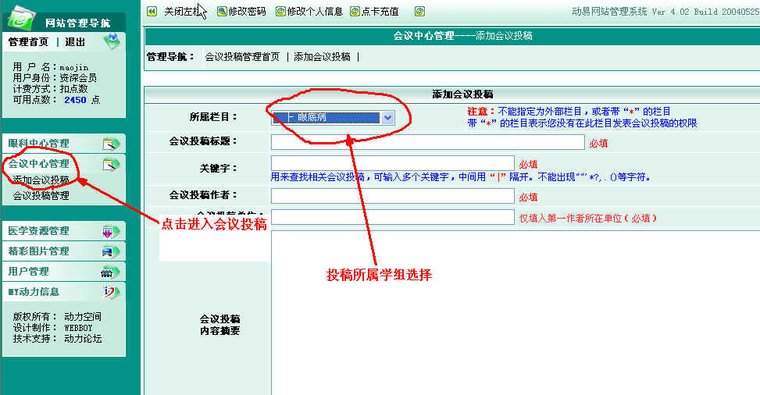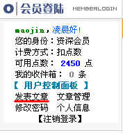 第二步:在登录投稿频道后,用户登录界面显示为下图所示,在用户控制面板中点击“发表文章