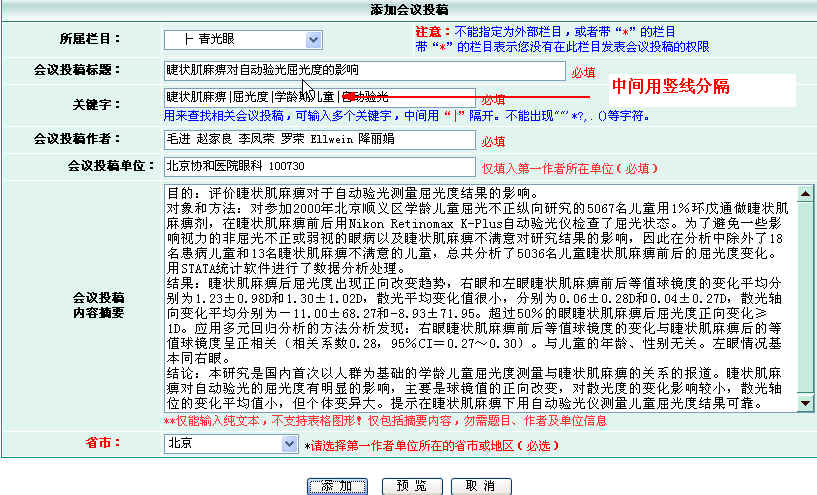 第四步:在相应的输入框中填入投稿的相关内容,包括题目、作者、单位、所在省市、摘要内容等。注意:关键字的分隔是用“|”,摘要内容仍然为四段式。投稿内容填写完毕后点击下方的“添加”就可以完成投稿,或者点击预览查看稿件效果。如下图所示
