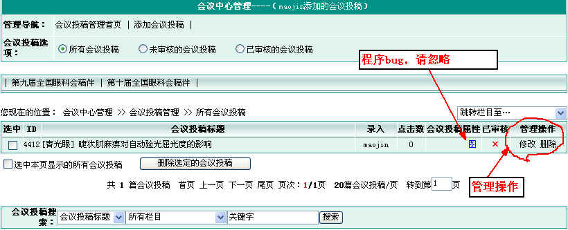 投稿成功后稿件不会立即出现在会议投稿网站上,需经过网站管理员的审核后方可从网站上访问。因此在投稿管理时可见“已审核”栏目标示为“×”。如下图所示