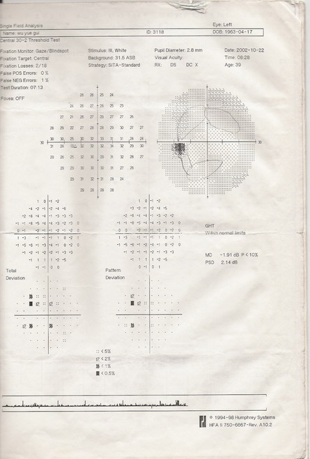 2005年4月8日因视物不清来诊,查体:VOD:0.25,VOS:1.0,右眼瞳孔直径5.0mm(对侧3.0mm),光反应迟钝,周边前房3/4CT,眼底视乳头色正,血管偏位,C/D=0.6,眼底鼻侧视网膜略显平脱。眼压:右25.3mmHg,左17.0mmHg,B超提示右眼视网膜脱离,视盘凹陷(青光眼型)。