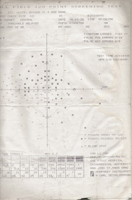2005年4月8日B超:右眼玻璃体轻度混浊,右眼视网膜脱离,视盘凹陷(青光眼型)