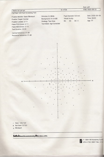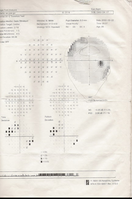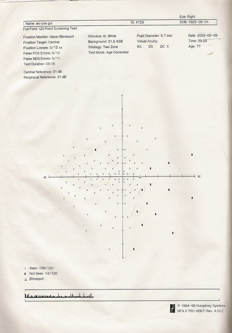 2003年11月12日B超:右眼玻璃体轻度混浊,右眼视网膜脱离