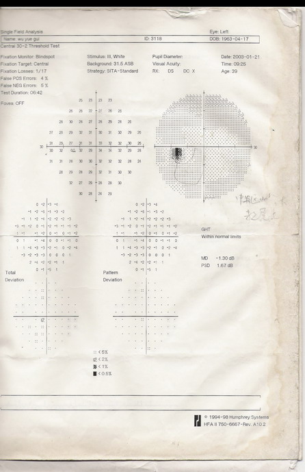 2004年3月因右眼眼压控制不理想青光眼急性发作再次住院接受治疗。并于2004年3月18日局麻下行右眼小梁切除+MMC术。