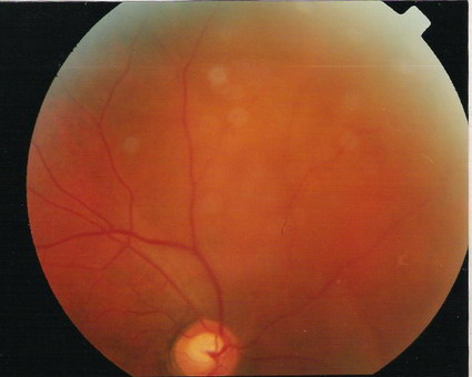 2003年11月诊断为右眼葡萄膜炎,视网膜脱离,继发青光眼,住院接受治疗。甲强龙80mg日一次静点7天,60mg静点5天,40mg静点3天,甲强龙40mg半球后隔日一次注射,并局部应用降眼压药。出院后继续甲强龙20mg静点3天,后改为30mg日一次口服,对症降眼压治疗。