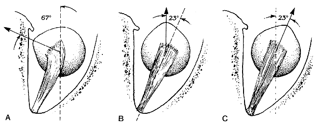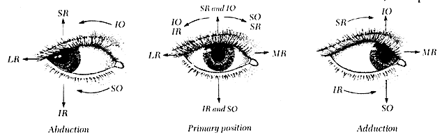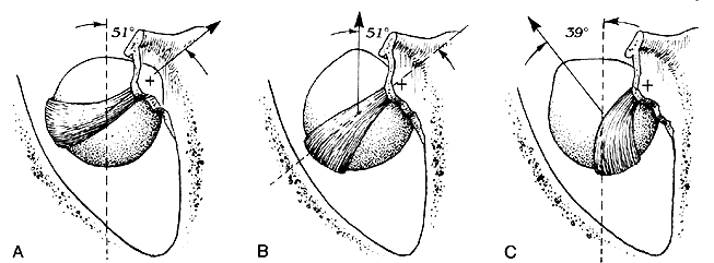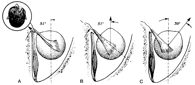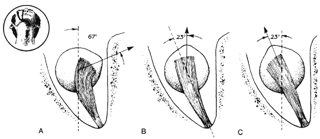 Duction The term duction refers to the movement of one eye. A prefix is attached to this word to indicate the direction in which the eye is moved (Fig. 1). Duction is accomplished by simultaneous and equally graded contraction and relaxation of antagonistic muscles, in accord with Sherrington's law of reciprocal innervation. Adduction Adduction is a horizontal movement directed medially from the vertical axis. It is primarily accomplished by contraction of the medial rectus muscle and relaxation of the lateral rectus muscle. Recessing the insertion does not reduce the adduction significantly until the recession exceeds 6 mm. In the primary position the muscle contacts the globe 6 mm as it arcs around the nasal sclera to insert. The medial rectus is a tight muscle; a maximum resection of 6 mm is possible without also producing resistance to abduction and slight retraction of the eye into the orbit (enophthalmos), with a reduction of the vertical dimension of the palpebral fissure. A small amount of secondary adduction is accomplished by contraction of the vertical rectus muscles: in upgaze by the superior rectus muscle, in downgaze by the inferior rectus muscle, and in the primary position by their combined contraction. Abduction Abduction is a horizontal movement directed laterally from the vertical axis. It is accomplished by contraction of the lateral rectus muscle and relaxation of the medial rectus muscle. Recessing the insertion does not reduce the abduction significantly until the recession exceeds 7 to 8 mm. In the primary position the muscle contacts the globe approximately 8 mm as it arcs around the temporal sclera to insert. The lateral rectus is not a tight muscle like the medial rectus, so excessive resection is less inclined to result in retraction of the eye into the orbit. However, resection of more than 8 mm does offer clinically detectable resistance to adduction. A small amount of secondary abduction is accomplished by contraction of the oblique muscles: in upgaze by the inferior oblique muscle, in downgaze by the superior oblique muscle, and in the primary position by their combined contraction. Supraduction Supraduction (sursumduction) is a vertical movement (elevation) directed superiorly from the horizontal axis of the eye. It is the result of the combined contraction of the superior rectus and inferior oblique muscles and the combined relaxation of the inferior rectus and superior oblique muscles. However, as the eye moves into an abducted position, the superior rectus becomes the prime elevator muscle, and as the eye moves into adduction, the inferior oblique is the principal elevator muscle. Since the superior rectus muscle courses forward from the orbital apex at an angle of 23° temporal to the medial wall of the orbit and inserts anterior to the center of rotation of the globe, the movement of the eye produced by the contraction of the muscle varies according to its horizontal starting position (Fig. 2). Starting from a position of 23° of abduction, the only movement is elevation. Starting from a position of 67° of adduction, the only movement is intorsion. Starting from the primary position, the movement is combined elevation and intorsion plus slight adduction; the adduction results from the midline of the muscle being medial to the center of rotation of the globe when the eye is in the primary position. Recessing the superior rectus muscle decreases all its functions; resecting the muscle enhances all primary position functions plus offers resistance to the relaxation of its functions. Recessions and resections of the superior rectus muscle in excess of 4 mm reduce the normal full vertical excursion of the eye in abduction; those in excess of 6 mm produce a detectable change from the preoperative primary position relationship between the superior limbus and the position of the upper eyelid. Postoperatively, the vertical dimension of the palpebral fissure remains unchanged from the preoperative value but the level of the eye is vertically changed; this causes the sclera to present above the limbus following excessive recession and causes the superior pupillary border to be tangential with the upper eyelid following excessive resection. Nasal transposition of the superior rectus muscle by one-half width enhances the adduction function, while temporal transposition of the same amount eliminates the secondary adduction, the effect being most conspicuous in midline upgaze. Infraduction Infraduction (deorsumduction) is a vertical movement (depression) directed inferiorly from the horizontal axis. It is the result of the combined contraction of the inferior rectus and superior oblique muscles. However, as the eye moves into an abducted position, the inferior rectus becomes the prime depressor muscle, and in adduction, the superior oblique is the principal depressor muscle. Since the inferior rectus muscle courses forward from the orbital apex at an angle of 23° temporal to the medial wall of the orbit and inserts anterior to the center of rotation of the globe, the movement of the eye produced by the contraction of the muscle varies according to its horizontal starting position (Fig. 3). Starting from a position of 23° of abduction, the only movement is depression. Starting from a position of 67° of adduction, the only movement is extorsion. Starting from the primary position, the movement is combined depression and extorsion plus slight adduction; the adduction results from the midline of the muscle being medial to the center of rotation of the globe when the eye is in the primary position. Recessing the inferior rectus muscle decreases all its functions; resecting the muscle enhances all primary position functions plus offers resistance to the relaxation of its functions. Unless the inelastic cords extending between the external capsular surface of the inferior rectus muscle and lower eyelid tarsus skin and the inferior orbital septum are completely severed