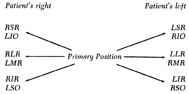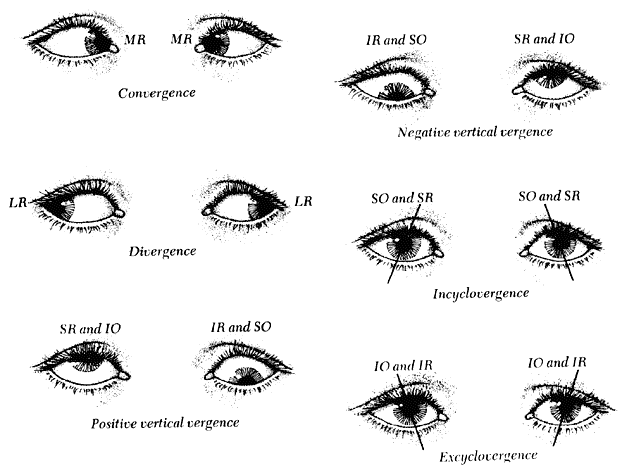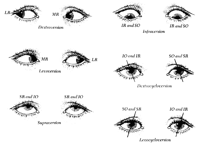 position. Secondary positions are any variation of eye position other than primary and include near fixation positions, cardinal positions, and midline vertical positions. Near fixation position is fixating straight ahead at a point at some arbitrary distance less than 6 meters. Distances for near fixation usually range from 0.25 to 1 meter, with most near testing of the eye alignment performed at 0.33 meter. Comparison of the near fixation and primary position alignments provides information about the reflex involving convergence and accommodation. Cardinal positions are the six gaze positions that compare the horizontal and vertical eye alignments produced by the six extraocular muscles. One muscle of each eye is the prime mover to achieve the six positions. The primary position and the six cardinal positions are illustrated in Figure 8, which also indicates the prime movers of each eye (yoke muscles) that achieve these positions. Three of the cardinal positions are in dextroversion; the other three are in levoversion. In each levoversion and dextroversion, elevation and depression are compared in addition to straight right and straight left gaze. Midline positions are straight up and down from the primary position. They are of value in comparing the elevating and depressing capabilities of each eye, but they do not allow a discreet comparison of isolated muscles of each eye, as the cardinal positions do. This is because each eye has two elevator and two depressor muscles, and both effectively move the eye in a vertical plane away from the primary position. The midline position is all-important for assessing horizontal alignment change as the eyes move in the vertical plane; this change consists of the A and V patterns. Eye position relative to the position of the upper lid is of interest. Normally, the upper lid follows the vertical eye movements, the eye maintaining approximately the same relative position to the superior limbus during movement. However, during sleep the levator muscle becomes atonic, permitting the lid to cover the eye; the eyes are usually elevated and diverged (Bell's phenomenon), and this movement is simulated by forced closure of the eyelids. Prying the eyelids apart as the patient attempts to forcibly close them reveals the eyes to be markedly elevated. |