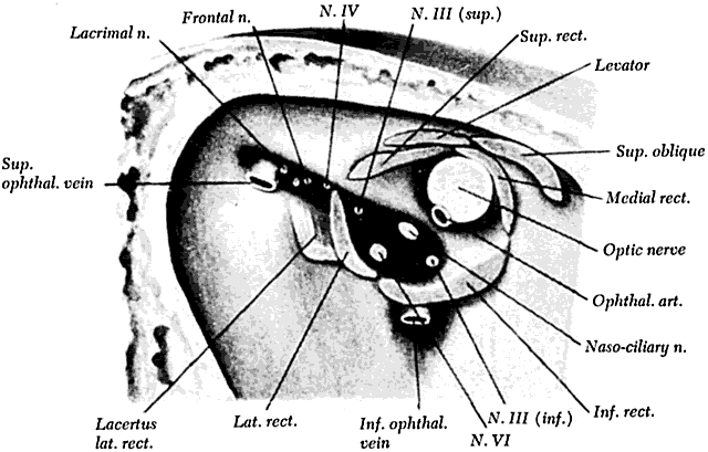 Once the oculomotor nerve penetrates the dura, it continues forward in the lateral wall of the cavernous sinus. It is positioned just above the fourth cranial nerve. In the anterior cavernous sinus, the oculomotor nerve divides anatomically into two distinct divisions, superior and inferior. The superior division innervates the levator and superior rectus muscles, whereas the inferior division innervates the inferior rectus, the medial rectus, and the inferior oblique muscles. The inferior division also contains the parasympathetic fibers for the ciliary muscle, the ciliary body, and the iris sphincter. Although a distinct anatomic separation into two divisions is not evident until the nerve reaches the anterior cavernous sinus, multiple clinical cases suggest that a discrete topographic arrangement of fibers exists as far proximally as the fasciculus.2–5,7–9 The superior and inferior divisions of the third cranial nerve enter the orbit through the superior ophthalmic fissure, subsequently passing through the annulus of Zinn. The superior division passes lateral to the optic nerve, where it divides into a number of branches, some entering the superior rectus muscle. Additional branches pass beyond the lateral aspect of the superior rectus muscle to reach the levator muscle. The inferior division splits into multiple branches that innervate the medial and inferior rectus muscles. The branch to the inferior oblique muscle passes laterally around the inferior rectus muscle and enters the inferior oblique muscle along its posterior and lateral border. This site has become an important anatomic landmark for surgery on the inferior oblique muscle.10 |
