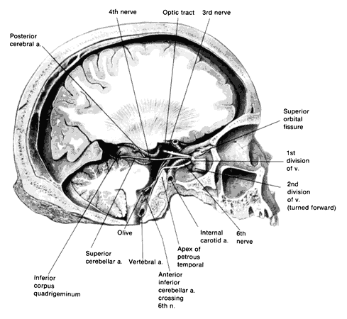 The third, fourth, and sixth cranial nerves innervate six extraocular muscles. These muscles are responsible for controlling the ocular rotations in horizontal, vertical, and torsional directions. The third cranial nerve also provides parasympathetic motor innervation to the intrinsic eye muscles, the ciliary muscle, and the iris sphincter muscle. Although these nerves originate at separate locations in the brain stem, they converge in the subarachnoid space and become closely associated in the cavernous sinus, superior orbital fissure, and posterior orbit (Fig. 1). From the cavernous sinus to the eye, they may be involved simultaneously in pathologic processes. |