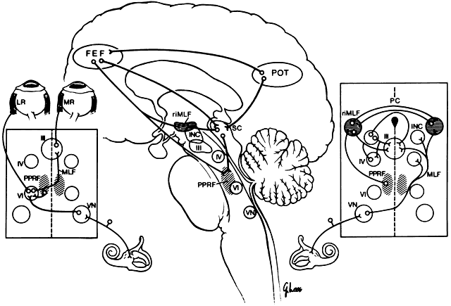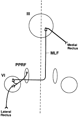 PARAMEDIAN PONTINE RETICULAR FORMATION The paramedian pontine reticular formation (PPRF)is the primary center responsible for generatinghorizontal conjugate gaze. The PPRF is positionedventral to the medial longitudinal fasciculus (MLF). It extends from the level of the trochlear nerve nucleus to the abducens nerve nucleus. Its major efferent projections are to the ipsilateral abducens nucleus (Fig. 1). Secondary efferent projections are to the rostral interstitial nucleus of the MLF (riMLF), which controls vertical gaze. Most afferent connections to the PPRF are from the vestibular nuclei, but there also is input from the cerebellum, superior colliculus, and frontal eye fields (FEF). Three types of cells have been identified in the PPRF: excitatory burst cells, inhibitory burst cells, and pause cells. The excitatory burst cells generate ipsilateral horizontal saccades by way of projections to the ipsilateral abducens nucleus. The axons from these cells synapse in the abducens nucleus onmotor neurons that innervate the ipsilateral lateral rectus and on interneurons that innervate the contralateral medial rectus subnucleus by way of the contralateral MLF (see Fig. 1). Burst cells discharge only when there is need for a fast eye movement and do not discharge during fixation, pursuit, or vergence eye movements. Inhibitory burst cell axons have their synapse in the contralateral abducens nucleus. Stimulation of these neurons decreases the firing rate of those motor neurons and interneurons, thereby inhibiting the antagonist muscles of the intended eye movement. Their firing rate is inversely proportional to the burst cells. Pause cells tonically discharge except when a saccade is being generated. These cells inhibit the burst cells within the ipsilateral PPRF. These cells are important during fixation and smooth pursuit. Abnormalities of these cells lead to opsoclonus and ocular flutter. Lesions of the abducens nucleus cause an ipsilateral gaze palsy. In the rare instance in which there is an isolated lesion of the PPRF, there is an inability to make ipsilateral saccades. However, the response to vestibular stimuli (e.g., oculocephalic testing, caloric) and pursuit will be preserved. This is because there is a direct connection from the contralateral medial vestibular nuclei directly to the abducens nucleus, bypassing the PPRF (Fig. 2). These fibers synapse on abducens motor neurons and interneurons to the contralateral medial rectus muscle. Thus, labyrinthine reflex and pursuit eye movements may continue to be generated. MEDIAL LONGITUDINAL FASCICULUS The medial longitudinal fasciculus (MLF) is a fiber tract that extends from the spinal cord to the oculomotor nerve nucleus. It contains primarily ascending fibers, the majority of which arise in the superior and medial vestibular nuclei. The MLF is in close proximity to the ocular motor nuclei and influences both ipsilateral and contralateral nuclei. An abnormality of the MLF causes problems with horizontal and vertical gaze coordination of the two eyes. The clinically most important connection passing through the MLF links the contralateral abducens nucleus with the ipsilateral medial rectus subnucleus. Abnormalities of this tract produce an internuclear ophthalmoplegia. Such a lesion produces slowed or complete loss of adduction of the ipsilateral eye and abducting nystagmus of the fellow eye. ROSTRAL INTERSTITIAL NUCLEUS OF THE MEDIAL LONGITUDINAL FASCICULUS The rostral interstitial nucleus of the medial longitudinal fasciculus (riMLF) is located in the mesencephalon at the rostral termination of the MLF. This nucleus includes cells from the interstitial nucleus of Cajal. The riMLF has connections to motor neurons in the oculomotor and trochlear nuclei, as well as to the PPRF. On the basis of experimental and pathologic studies, this group of cells appears to be the immediate premotor area for vertical eye movements, both upward and downward. Its function is thus analogous to the PPRF for vertical eye movements. Damage to this area generally causes more difficulty with downward movement than with upward movement. POSTERIOR COMMISSURE Dorsal and rostral to the riMLF is the posterior commissure, a fiber tract that contains some scattered neuronal cell bodies. Lesions in this region produce abnormalities of upward gaze. It is likely that the fibers for upward gaze leave the riMLF and pass through this region before reaching the oculomotor and trochlear nuclei. Involvement of the posterior commissure may be part of the dorsal midbrain syndrome (Parinaud Syndrome). In this syndrome, there is impairment of upwardly directed saccades or, in extreme cases, loss of all vertical movement. Other signs include pupillary mydriasis and light-near pupillary dissociation, corectopia, and convergence-retraction nystagmus. SUPERIOR COLLICULUS These structures in the dorsal midbrain play a role in both ocular motor and sensory function. The superior colliculus receives visual input directly from branches of retinal ganglion cell axons. Visual input also comes indirectly from the visual cortex, the parietal and frontal lobes, and the substantia nigra. There are efferent projections to the brain-stem premotor areas. The superior colliculus can generate visually directed saccades independently and may play a role in the control of pursuit eye movements. In primates, ablation of both FEFs and both superior colliculi is necessary to produce permanent saccadic defects. CEREBELLUM The cerebellum appears to be involved in the immediate modulation of ongoing eye movements, as well as in the long-term adaptive processes that compensate for ocular motor dysmetria. The cerebellum controls and adjusts the size of saccades. The latter ability is essential for maintaining accurate ocular motor performance during growth and aging, during and after ocular motor disease, or even while using spectacles. For instance, the use of anisometropic spectacles produces a varying aniso