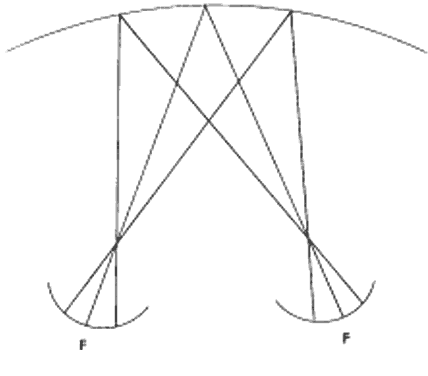 In sensory testing of a patient's binocular mechanism, color rivalry and color fusion (tints) form the basis of some tests. For example, a red lens before one eye and a green lens before the other causes the white viewed light to be perceived in color rivalry if the patient has single binocular vision; otherwise, either a red or a green sustained light is perceived. Another is the red glass test, in which a red glass is held before one eye while the patient views a white light. The patient with binocular vision sees a pink light (diluted from red), whereas the patient without fusion sees either a red or white light. ANGLE The angle of the light waves entering the eye has a significant response in binocular vision that is lacking in monocular vision. This is attributable to an object in space projecting onto retinal photoreceptors in each eye that have identical localizing values. A pair of such neuroepithelial elements is referred to as corresponding points. The foveas, as well as all other photoreceptors of the two eyes having identical directional values, are corresponding points. Images projected on these points are localized in space with the same values as though they were on only one of the corresponding points. Lines drawn from corresponding points through the nodal points of the eyes intersect in space either at a distance remote from the eyes or at a distance close to the eyes, depending on whether the eyes are fixating a distant point or are converged to fixate a near point. An imaginary plane including all the points of intersection of these lines in space is a horopter (Fig. 2). The horopter is an infinitely thin toric plane in space with its center being the fixation point. The concavity of the distant horopter is almost nil, but it increases with increasing nearness of the fixation point and consequent convergence. An object located at any point on this plane projects images onto corresponding points on the retina. The angle formed by the intersecting fixating axes equals all the other angles formed by lines drawn from all other corresponding retinal points that intersect at the horopter. Fusion All objects projecting onto corresponding points have their two images fused into one perception; however, the neurophysiology involved in binocular vision does not impose such a rigid requirement for fusion. Objects projecting onto slightly disparate retinal points also may be fused, provided that the disparate images are within a critical limit. The quantity of disparity between foveal images that permits fusion is small, but the permissible disparity of images, which allows fusion, increases progressively for the more peripheral retinal points. Therefore, for each retinal point in an eye, there is a definable corresponding area in the retina of the opposite eye within which the same image must project if the two images are to be fused into one (Fig. 3). The more eccentric the retinal point from the fovea, the larger the corresponding area is in the other eye. Lines drawn from the boundaries of the corresponding areas through the nodal point of the eye intersect in space, with each line extending from the corresponding point of the opposite eye. The line from the temporal boundary intersects the line of the corresponding point of the opposite eye proximal to the horopter (see Fig. 3). As in the construction of the horopter, if all points of the intersecting lines proximal to the horopter from retinal points and the temporal boundaries of the corresponding retinal areas of the opposite eye were connected by a plane, the proximal boundary of Panum's area would be defined. The distal border is defined by joining together all intersecting points distal to the horopter of lines from retinal points in an eye and the nasal boundaries of the corresponding retinal areas of the opposite eye. Since the peripheral retinal points have corresponding areas with larger dimensions than central retinal points, Panum's area is most narrow at its center and widens as it proceeds peripherally from the fixation area. The retinal area in one eye that corresponds to the fovea in the other eye permits inexact alignment of the visual axes. While the object of regard is imaged on the fovea of one eye, it is slightly displaced from the fovea in the other, yet single binocular vision occurs rather than diplopic binocular vision. The inexact fixation of one eye (Fig. 4) in the presence of single binocular vision is called fixation disparity.4 It is physiologic, and the maximal quantity of deviation of the fixation axes may range between 10 and 14 minutes of arc. If there is a convergent deviation (esodeviation) of the eyes, although fusion keeps the deviation latent to the degree that single binocular vision is possible (esophoria), there is an esofixation disparity. Divergent deviation (exodeviation) is accompanied by exofixation disparity. Simultaneous Perception All objects distal or proximal to Panum's area project their images outside corresponding retinal areas and are not fused. An object outside Panum's area projects its images on the retinas with a degree of disparity exceeding the boundary of the retinal area of one eye that directionally corresponds to the retinal point receiving the image in the other eye. Although these disparate images are not fused, if they are perceived simultaneously, the object is simultaneously localized by the eyes to different places in space (diplopia). All objects not located within Panum's area are diplopic unless the observer is inattentive to these objects. The diplopia due to simultaneously perceiving objects distal and proximal to Panum's area is physiologic, since this phenomenon is a component of normal single binocular vision. The physiologic diplopia is perceived as heteronymous for an object proximal to Panum's area, and homonymous for an object distal to Panum's area. If the object is in midline or laterally displaced short of a specific threshold from midline