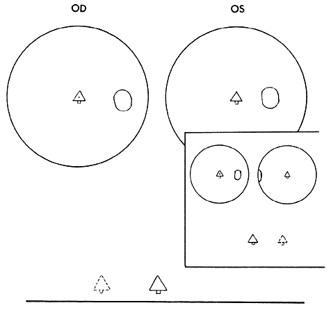 are discussed in Chapter 5. Pertinent to this chapter on the adaptations of binocular vision in strabismus and the most important difference between macular and extramacular fusion reflexes is the absence of any adaptation by the macular fusion reflex in the strabismic patient. The reflex is impossible to adapt to the newly acquired strabismus because it ceases to function the moment the eyes deviate from being straight. For an adaptation of the binocular vision reflex to occur, the reflex must continue functioning during strabismus, which causes annoying symptoms that are eliminated by the adaptation. Only the extramacular fusion reflex continues functioning after the onset of the strabismus. Hence, the adaptations of binocular vision in strabismus are restricted to the extramacular fusion reflex. Binocular vision is an acquired reflex that normally develops during the first 3 to 4 months of life. Its development demands certain requisites. The infant must be capable of seeing with each eye, and both eyes must be aligned with one another, permitting similar retinal images to project onto corresponding retinal areas during the critical period for binocular vision development, which extends to approximately 2 years of age. Patients with congenital or very early onset strabismus do not receive the essential stimulation from similar images projecting onto corresponding retinal areas; consequently, their binocular vision reflexes do not develop. Absence of binocular vision is elicited by sensory tests yielding responses that prove the absence of simultaneous perception of images on each retina (Chapter 9). Patients1,2 without binocular vision experience none of the untoward visual symptoms that are associated with newly acquired strabismus in those who have developed binocular vision. Their only visual handicap is absence of stereopsis, which they are as unable to comprehend as the colorblind person is unable to comprehend a deficiency in color perception. Despite the absence of binocular vision, if the attention directed to the object of regard results in fixating first with one eye for a moment and then fixating with the other eye for the next moment, such alternate fixation ensures normal monocular macular function in each eye. However, if the attention to the object of regard was fixated exclusively with one eye during the amblyogenic age, amblyopia will be apparent in the unused eye. |