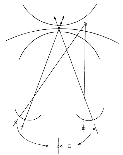 same place in space (visual confusion). DIPLOPIA Diplopia results from the simultaneous perception of the images of the object of regard projecting onto noncorresponding retinal areas of the strabismic eyes. The simultaneous perception of the two similar images under these circumstances yields the impression that the object of regard is simultaneously located at two points in space (Fig. 1). The size of the retinal area in one eye that corresponds to a retinal point in the other eye rapidly expands for retinal loci increasingly peripheral to the fovea. This determines the degree of retinal image disparity that either the macular or extramacular fusion reflex find tolerable. It accounts for Panum's visual space. Thereby, the depth of Panum's visual space is very limited for the macular fusion reflex to function within compared with the ever-expanding depth of fusional space within which the extramacular fusion reflex operates. This explains how an esotropic deviation may be sufficiently small to allow a spatial target peripheral to the object of regard (yet within Panum's fusional space) to project the peripheral target's images onto corresponding retinal areas while the object of regard projects its images onto noncorresponding macular areas (Fig. 2). According to Ogle,3 foveal horizontal image disparity greater than 20 minutes of arc (2/3 of a prism diopter) is not fusible. From my clinical investigation it appears that extramacular image disparity is fusible up to approximately 480 minutes of arc4,5 (8 prism diopters). The vast differences in tolerance of horizontal image disparity between macular and extramacular fusion suggest they are under the control of separate binocular vision reflexes. This reasoning is strengthened by the frequency of clinical cases that are devoid of a macular fusion reflex but have a normal extramacular fusion reflex. The purpose of the macular fusion reflex is to produce and maintain bifixation. If the reflex is absent or intermittently shut down for any reason, the patient monofixates. Monofixation is manifest by a three-degree facultative macular scotoma present only in the nonfixating eye during binocular viewing while the intact normal extramacular fusion reflex remains within 0 to 8 prism diopters of horizontal eye alignment. Such a large range of tolerance for horizontally disparate retinal images to be fused in the monofixator is easily demonstrated using stereopsis tests. Although the stereoacuity is poor in the monofixator compared with the bifixator,6 it does exist as long as the horizontal deviation of the eyes does not exceed 8 prism diopters. Along with the intact stereopsis, the fusional vergence amplitudes also remain normal in the monofixator as long as the horizontal deviation of the eyes does not exceed 8 prism diopters. In my experience, normal fusional vergence amplitudes and stereopsis perception occur only in normal retinal correspondence (NRC) but not in the adapted abnormal retinal correspondence (ARC). Stereopsis can occur only if the horizontally disparate images in the monofixator's peripheral vision are from targets within Panum's fusional space. Although the center of the Panum's area is scotomatized, the peripheral Panum's area exists in small angles of deviation. To maintain this small horizontal deviation of 0 to 8 diopters (D) requires a good functioning fusional vergence reflex that can be generated by NRC but not by ARC. VISUAL CONFUSION Visual confusion occurs in strabismus as a result of the projection onto corresponding retinal areas of simultaneously perceived dissimilar images of two different spatial objects that normally project onto noncorresponding retinal areas. Consequently, these different objects in space that create dissimilar images are perceived as located at the same place in space. Visual confusion does not exist for all portions of the visual field. The object of regard visually perceived by the fixating eye cannot simultaneously perceive a superimposed different image projecting on the fovea of the deviating eye. From the physiologic fact of binocular vision, as stated in Chapter 5, Fig. 13, only similar images projecting on the foveas are perceived simultaneously. No binocular function results from dissimilar images projecting onto these retinal areas. Consequently, from the moment the strabismic eyes deviate the patient is spared the visual confusion of a different spatial object's image conflicting with the object of regard. The three-degree macular scotoma in the esotropic left eye (Fig. 3) can be plotted using a binocular perimetric technique. This is a physiologic scotoma, present in all strabismic patients immediately at the moment the alignment of the eyes exceeds the threshold of 2/3 of a prism diopter. Therefore sustaining the bifixation reflex requires a very refined ocular alignment control along with an elegant level of similarity of the foveal images. The combination of these two inputs provide the essential stimuli for bifixation. The moment one or both are lacking, the bifixation reflex shuts down and a macular scotoma appears in the nonfixating eye. It is not a pathologic scotoma that evolves gradually to resolve the annoying visual symptom caused by strabismus. It is not an adaptation of the macular fusion reflex that gradually developed to eliminate visual confusion. In short, it is not a suppression scotoma. RETINAL IMAGE SIMILARITY VERSUS DISSIMILARITY In addition to image disparity, another stimulus that pertains to the alignment of the eyes with certain thresholds required for fusion is image dissimilarity. The threshold for image dissimilarity acceptable for fusion is different for macular fusion compared with extramacular fusion. Dissimilar image parameters are size, shape, clarity of focus, illumination brilliance, and color. Each has its threshold of dissimilarity that eliminates fusion. Anisometropia, media disturbances within the ocular tissues, optical appliances, and so fo