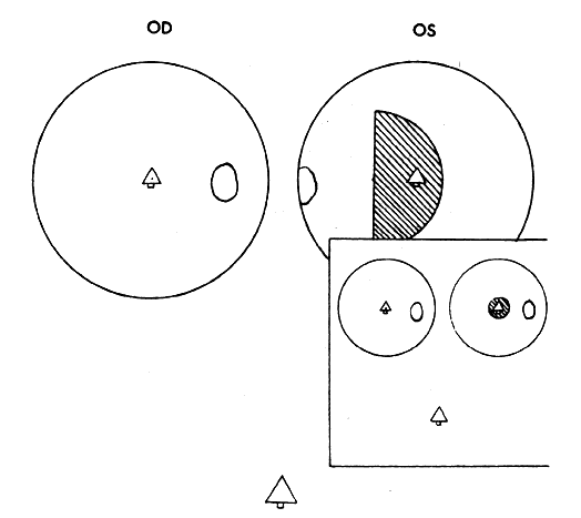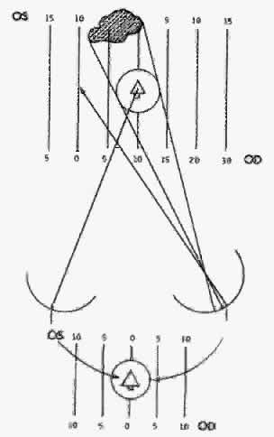 PHYSICAL ADAPTATIONS The onset of strabismus in a person who has developed binocular vision produces three distinct annoying symptoms: central vision diplopia, peripheral vision diplopia, and peripheral vision confusion. Two factors offer partial relief from central vision diplopia. One is the perceptual difference in the sharpness and clarity of the two similar images of the object of regard because one object is projected onto the fovea of the fixating eye and the other is projected onto the extramacular area of the nonfixating eye. However, the visual acuity difference that results between the two eyes pertains only to contoured images and not to the images from a light with no contour. Also, it pertains to viewing the images during daylight. Under these visual circumstances, the better-seen image provides the important clue for the strabismic patient to locate correctly the object of regard in space. However, during scotopic vision or when viewing contourless objects, the patient is without the differential clues of sharpness and clarity to direct attention to the correct image. The ability to be attentive to only one of the diplopic images of the object of regard is subconsciously enhanced by a rapid blink of the nondominant eye. The image that correctly localizes the object of regard is immediately identified, and as long as the patient's attention remains directed to this image, correct localization of the object continues. This tactic functions satisfactorily as long as the object of regard remains isolated and stationary during either photopia or scotopia, but if the patient is viewing a series of moving contourless objects, such as multiple oncoming headlights during nighttime driving, only sustained voluntary closure of the nonfixating eye may avert catastrophe. CORTICAL ADAPTATIONS Once the extramacular fusion reflex is established it never is completely surrendered. It is capable of being altered in various ways to alleviate the annoying symptoms a strabismic patient experiences because of its continued function while the eyes are misaligned. The symptoms are diplopia, both from the spatial area of conscious regard and visual space surrounding it, and visual confusion from only the visual space surrounding the area of conscious regard. Collectively, they all contribute to the patient's insecurity in orientation in visual space. If the patient could shut down the extramacular fusion reflex, as the macular fusion reflex was shut down the moment the eyes deviated, the symptoms would not exist. However, the continued function of the extramacular fusion reflex after the eye alignment no longer is controllable by the fusional vergences results in this constellation of symptoms. Fortunately, the extramacular fusion reflex possesses the virtue of being able to adapt its normal physiologic function to eliminate the annoying symptoms that a newly acquired strabismus causes. Two adaptations exist, and they develop gradually at approximately the same rate after the onset of the strabismus. Adapting for the symptom of the central visual field diplopia is a cortical phenomenon, called suppression, that affects a restricted area in the deviated eye's peripheral retina. The other cortical adaptation, called ARC, eliminates the peripheral visual field diplopia and visual confusion. Time and exposure to the annoying symptoms are required for these adaptations to develop. The time required for their gradual development is minimal in young children compared with older children and adults. Children seem more tolerant to the symptoms than adults and relief for children arrives within days, whereas adults may take weeks to receive relief. Adults are far more impatient than children. The newly acquired strabismic adult is prone to react to the diplopia and visual confusion by occluding one eye and never giving the adaptations an opportunity to develop. Suppression Suppression is a positive inhibitory reflex that occurs within the extramacular fusion reflex and permits the cortex to ignore visual sensations dispatched from the retina of the nonfixating eye, on which are projected the images from the area of conscious regard. If either eye can maintain fixation, suppression is demonstrable in the nonfixating eye. In contrast to the physiologic macular scotoma that can be plotted in the deviated eye, the extramacular suppression scotoma is pathologic. It is absolute, but it is also facultative because it is nonexistent during monocular vision. Therefore, it may be plotted in the nonfixating eye only during binocular perimetry. The shape and the size of the suppression scotoma in esotropia (Fig. 4) differ significantly from the scotoma in exotropia. The nasal retina in esotropia usually has a scotoma of approximately 5 degrees, whereas the temporal retina in exotropia produces a scotoma extending peripherally from the hemiretinal line for the number of degrees required to include the image of the object of regard. This difference in size and shape of the scotomas in the nasal and temporal retinas is unexplainable. Patients with vertical and/or cyclodeviations have the same suppression adaptation as the horizontal deviations. Also, the suppression scotoma is not rigidly located to a fixed retinal area. In patients with deviations that vary according to different gaze positions, the scotoma in the binocular field shifts across the retina according to the location where the object-of-regard image projects onto the extramacular area of the nonfixating eye. Also, it shifts from one eye to the other as rapidly as the patient alternates fixation, a feature shared also by the physiologic macular scotoma. Unlike the pathologic suppression scotoma that developed in the extramacular binocular vision reflex, the physiologic macular scotoma remains rigidly in the same location, which is the macula of the deviated nonfixating eye. Recall that this scotoma is smaller (three degrees) than the suppression scotoma. The 