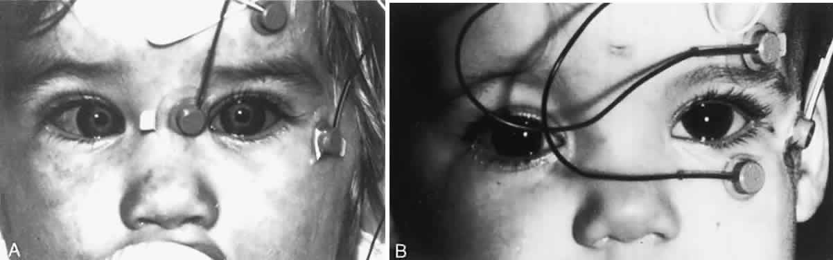 MYASTHENIA GRAVIS Approximately half of all patients with myasthenia gravis present with symptoms related to eye movements and lids. Response to intravenously administered edrophonium chloride (Tensilon) by improved oculomotor function is considered diagnostic. Such improvement may be uncertain or elusive. Tests to demonstrate equivocal degrees of improvement include red-green glass diplopia, tonography, ocular electromyography, and optokinetic nystagmus. Because saccadic velocities are affected by mild to moderate degrees of paresis, analysis of these movements can be a consistent, reliable, objective indicator of the effect of edrophonium on the oculomotor function of patients with myasthenia gravis. Saccades, reduced in velocity due to myasthenia gravis, become rapid after edrophonium administration. This is demonstrated nicely using recordings of optokinetic nystagmus. A fatigue effect is noted with continued stimulation, followed by rapid recovery of good nystagmic eye movements and an increase in the velocity of the saccadic portion of the nystagmus23 (Fig. 15). After the edrophonium has worn off, the pattern of eye movements returns to the preinjection level. Several investigators have reported increased amplitude of optokinetic nystagmus after edrophonium administration to myasthenic patients.24–26 Yee and coworkers27 found that during large saccades, a high velocity cannot be sustained. After a rapid, initial movement of the saccade, velocity decreases rapidly and the eyes slowly drift toward the target. Intrasaccadic fatigue of extraocular muscle fibers, which normally generates the rapid eye movement in response to pulse innervation from the oculomotor neurons, appears to produce the sudden decrease in saccadic velocity. CHRONIC PROGRESSIVE EXTERNAL OPHTHALMOPLEGIA In its early stages and milder forms, chronic progressive external ophthalmoplegia often is misdiagnosed. Patients frequently present with ptosis and ophthalmoplegia. The ophthalmoplegia tends to be symmetric comparing the two eyes, and both the lid and ocular motility deficits are unresponsive to administration of edrophonium, which is helpful in differentiating this entity from myasthenia gravis. In addition, no worsening is observed with fatigue. Saccadic speed, both horizontally and vertically, is reduced in this group of patients. The degree of slowing varies among patients (a range of 20 to 150 degrees per second).28 The slow velocity is symmetric between the two eyes of the same patient, however, which helps distinguish this condition from other ophthalmoplegias. This has diagnostic value because it may obviate the need for an unwarranted neurologic workup and point out the possibility of heart block in some of these patients. INTERNUCLEAR OPHTHALMOPLEGIA Lesions of the medial longitudinal fasciculus demonstrate deficient adduction and jerk nystagmus of the abducting eye. Patients often are orthotropic in the primary position, and adduction with convergence may be preserved. In some cases of internuclear ophthalmoplegia, the clinical signs are not obvious. The bilateral form almost always is indicative of multiple sclerosis; thus, a simple test that could establish the diagnosis would be valuable in patients who otherwise might require more formidable and prolonged studies. Abduction saccades are normal in velocity, whereas adduction saccades in the uninvolved eye of patients with monocular internuclear ophthalmoplegia also are normal. Adduction saccades in the involved eye are reduced in speed, and the eye movement tracing demonstrates the abduction nystagmus well29 (Fig. 16). In the early stage of internuclear ophthalmoplegia, when adduction appears full, saccades may be slow, a fact that is of use in the diagnosis. Dell'Osso and associates30 also found that recovery saccades of optokinetic nystagmus, produced by the involved medial rectus, are slow. Siroky and coworkers31 demonstrated slow recovery saccades produced by the medial rectus in postrotary nystagmus in patients with internuclear ophthalmoplegia. They showed that it was possible to discover the latent form of internuclear ophthalmoplegia in the early disease state by using eye movement recordings. MÖBIUS SYNDROME Möbius syndrome is characterized by congenital facial diplegia associated with limitations of horizontal eye movements. Vertical rotations are intact. Other anomalies sometimes seen include lagophthalmos, partial atrophy of the distal tongue, congenital heart defects, and extremity abnormalities. Most patients are esotropic and have a range of horizontal eye movement as small as 10 degrees. Saccadic velocities are very slow, both toward abduction and adduction,32 indicating more than sixth-nerve involvement. Electromyographic evidence suggests the existence of a supranuclear lesion affecting the horizontal rectus muscles.33 |