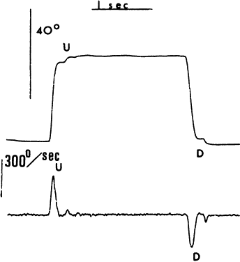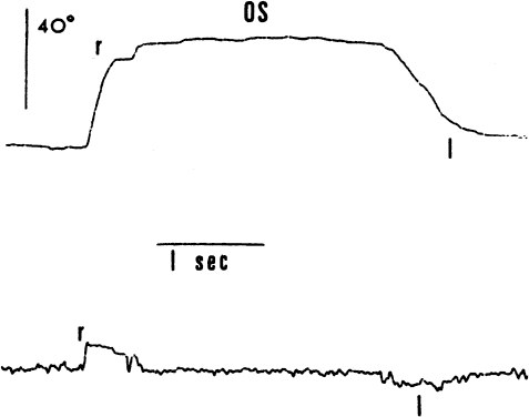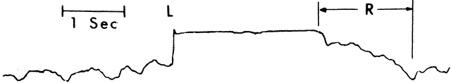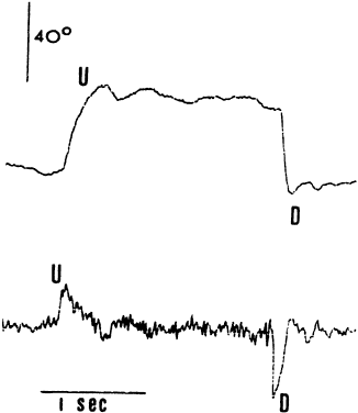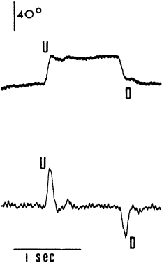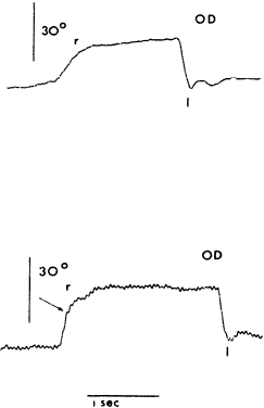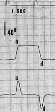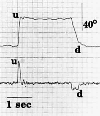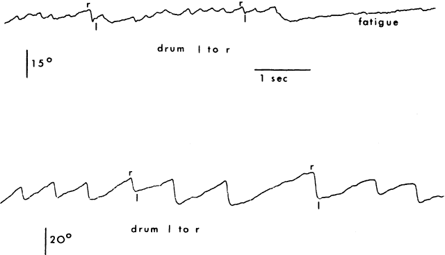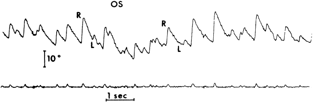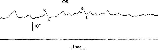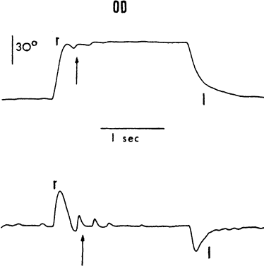 Saccades usually are generated by voluntary eye movements of 20 to 40 degrees across the primary position, either horizontally or vertically. In patients in whom paralysis or restriction prevent rotations of this size, the largest eye movements possible are recorded. Calibration is performed by having the subject make a 20-degree saccade using the eye being studied for fixation. A bowl perimeter can be useful in quantifying the size of the saccade for calibration. With infants and young children, saccades can be generated involuntarily by the use of optokinetic or vestibular nystagmus. The rapid recovery phase of nystagmus is a saccadic eye movement. A small, rotating drum or optokinetic nystagmus tape can be used to elicit optokinetic nystagmus, whereas spinning an infant in his mother's arms can induce vestibular nystagmus. Normally rapid, recovery saccades of optokinetic nystagmus are shown in Figure 3, whereas the slow recovery saccades produced by the lateral rectus muscle in a patient with sixth nerve palsy are shown in Figure 4. To provide reliable calibration in very young patients, the child's fixation with one eye can be obtained by showing a colorful, moving, noisy toy at a distance of one third of a meter. A 10-Δ prism is introduced before the fixing eye, and the resulting horizontal eye movement is recorded by electro-oculography. The recorded eye movement can be used for calibration as the distance the eye moved is known.6 During the studies, it seems to make little difference whether the paretic or nonparetic eye is used for fixation, as long as equal amplitude saccades are used for comparison.7 For calibration purposes, however, the eye in which saccades are to be measured must be used for fixation . Raab8 found peak saccadic velocity determinations for 20-degree saccades to be distributed normally and range from 281 to 541 degrees per second. He concluded that peak horizontal saccadic velocities of less than 300 degrees per second are likely to be abnormally slow using his Tracoustics equipment. |
