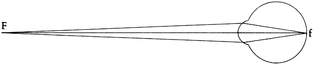 Light rays originating from a point more than6 meters in front of the eye are considered for practical purposes to be parallel on entering the pupil. At any point closer to the light source, the rays are said to have vergence, which is measured in diopters. The vergence of a light ray is equal to the reciprocal of its distance, in meters, from its point of origin. Thus, the vergence of light rays at a given point measured in diopters is inversely proportional to the distance from the focal point of those rays. This focal point may be in front of or behind a given reference point, resulting in divergent (i.e., minus vergence) or convergent (i.e., plus vergence) light rays, respectively. The divergence of light rays20 cm from an object of regard with a vergence of-5.0 D is 10 times greater than the divergence of light from the same object at 200 cm with a vergence of -0.5 D (Fig. 2).