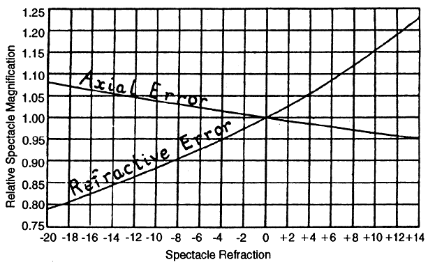 Myopia can be characterized as refractive or axial, although a continuum of the two types exists. In refractive myopia, the overall refractive power of the eye as determined by cornea and crystalline lens power, modified by anterior chamber depth, is excessive in relation to an eye of normal axial length (21.5 to 25.5 mm). The axial length is normal because it is the product of normal growth. Axial myopia is the result of an excessive elongation of the eye with respect to its refractive components. In these eyes, there is added expansion due to stretching of the scleral wall. These differences in refraction components can have clinical effects. It is of some clinical importance to appreciate that equal amounts of myopic progression are produced by smaller increases in axial length in refractive myopia compared with axial myopia. For example, in refractive myopia, 0.34 mm of axial length change equals approximately 1 D of refractive error change, whereas in axial myopia, 0.4 mm of axial length change equals approximately 1 D of refractive error change.6 The differences between axial and refractive myopia also can affect retinal image size, which is discussed under Image Minification later in the chapter. |