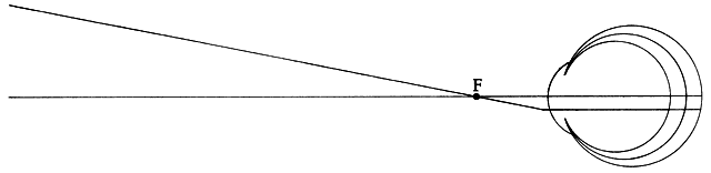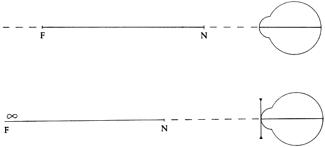 Myopia is defined as that optical condition of the nonaccommodating eye in which parallel rays of light entering the eye are brought to a focus anterior to the retina. It also can be described as the condition in which the far point of focus is located at some finite distance in front of the cornea. For practical purposes, this is a distance of less than 6 meters, the distance at which visual acuity is normally tested. Thus, the uncorrected, nonaccommodating myopic eye has some point at a finite distance beyond which objects are not seen clearly. At this far point, an object is in clear focus, but with increasing distances beyond it, the image becomes progressively more indistinct (Fig. 1). This far point also is defined as the focal point of the eye. The degree of myopia in diopters is found by determining the reciprocal of the far point or focal point of the eye measured in meters. Therefore, P = I/f where P is the power of the refractive error in diopters and f is the distance of the far point or focal point of the eye in meters from the eye. If thefar point of an eye is at 33.3 cm, then the eye is1/0.333 m = 3.0 D myopic. |