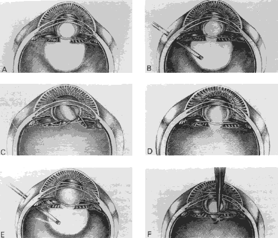 eyes corrected with contact lenses. The improved visual outcome associated with IOLs is presumably related to the constancy of the optical correction. In addition, pseudophakic children have been reported to have superior binocu-larity and a lower incidence of subsequent strabismus than children corrected with contact lenses.18 Another important consideration is the convenience of IOLs. Whether worn on a daily-wear or an extended-wear basis, contact lenses require a considerable amount of care. Parents usually must care for the contact lenses worn by their child. The time spent caring for these contact lenses is time that could potentially be spent interacting in more positive ways with the child. IOLs also provide a constant correction, whereas even the most compliant child will have periods of time when the contact lens cannot be worn because of an ocular infection or a lost or damaged lens. In addition, an IOL provides an immediate optical correction after implantation, whereas a delay of several days or even weeks often occurs before contact lenses or glasses are dispensed.20 Finally, IOLs, unlike contact lenses, are not associated with ongoing expenses and are therefore particularly well suited for families who have limited financial resources.21 Despite the widespread acceptance of IOLs for the optical correction of aphakia in children, there exists considerable controversy regarding the optimal technique for IOL implantation in a child's eye (Fig. 1). A child's eye differs in several significant ways from an adult eye. First, there is nearly universal opacification of the posterior lens capsule after cataract surgery.21 This opacification can occur a few weeks after cataract surgery or years later.22 In older children, the posterior capsule is frequently left intact at the time of cataract surgery and opened with a Nd:YAG laser when opacification occurs.23 This approach requires that the patient return for regular follow-up visits and that the patient be sufficiently cooperative to allow the capsulotomy to be performed in the clinic. If treatment is delayed, excessive amounts of laser energy may be required to create an adequate capsulotomy.24 In addition, opacification of the anterior hyaloid face frequently occurs after a YAG capsulotomy in young children, necessitating repeated YAG capsulotomies or a surgical membranectomy.25 Alternatively, a primary posterior capsulotomy may be created either with or without an anterior vitrectomy. Some authors have stressed the importance of combining an anterior vitrectomy with primary posterior capsulotomy,26,27 However, Fenton and O'Keefe28 reported a clear visual axis in 84% of children after a 19-month follow-up after a primary posterior capsulotomy alone. Gimbel29 suggested that prolapsing the lens optic through the primary posterior capsulotomy reduced the incidence of secondary membranes forming across the pupillary space, but Koch and Kohnen30 reported nearly universal opacification of the visual axis using this approach. The anterior vitrectomy may be performed through the limbal incision before IOL implantation or through the pars plana after IOL implantation.31 Although performing the posterior capsulotomy through the pars plana makes it technically easier to implant the IOL in the capsular bag, a randomized clinical trial failed to find any difference in the outcome between the two techniques.32 The type of IOL implanted may also affect the incidence of posterior capsule opacification. IOLs that create a symmetric radial stretch of the posterior capsule may increase the contact between the convex IOL surface and the posterior capsule, thereby creating a barrier to the central migration of epithelial cells.33 Acrylic lenses may be associated with both a lower incidence and a delayed onset of posterior capsular opacification. Possible reasons for the lower incidence of posterior capsular opacification with acrylic lenses include the square edge of the lens, greater biocompatibility, and increased capsular adherence. Finally, heparin-surfaced modified PMMA lenses have been reported to reduce the cellular deposits on IOLs in a child's eye.34 Children also differ from adults in that they are more likely to traumatize their eye after cataract surgery. Therefore, a superior incision has the advantage over a temporal incision of allowing the brow to protect the incision site. A sutureless incision is inappropriate in children because of the greater likelihood that they will rub their eye and cause dehiscence of the incision site.5 |