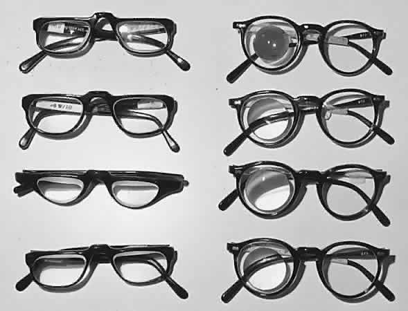 Driving with telescopic lenses has always been considered controversial.39 Many years ago the only way in which a person could pass a driver's test was to have spectacle- or contact lens-corrected 20/40 vision or better. Years before that, however, it was only 20/70. Most states in the United States have now modified their driving visual requirements in that 20/40 is the designated 24-hour driving vision and the 20/70 visual acuity needed to pass the driver's test for daylight driving only. Daylight driving is designated as 1 hour before sunrise and 1 hour after sunset. The reason telescopic lenses are considered controversial is because of the limited field, which reduces peripheral vision. Considerable training is necessary to achieve success with these generally expensive spectacles. Some practitioners who prescribe telescopic lenses for driving often prescribe the telescope to be placed at the top of the lens of one spectacle and recommend using it for spotting purposes only. Some patients use telescopic spectacles for watching television at a distance even though these lenses limit the depth of focus and the peripheral visual field. Having patients sit close to the television screen affords a wider field and the magnification of nearness. Telescopes can also be used for near and intermediate tasks. One can focus telescopes for near viewing by adding plus lenses behind the ocular, by adding plus lenses in front of the objective lens, or finally by increasing the tube length of the telescope. The greatest advantage of using a near focused telescope for a close visual task is the increased working distance afforded the user. The working distance with a near telescope is increased over a simple microscopic magnifying spectacle by a factor of the power of the telescope. For example, a 3× telemicroscopic system focuses at 10 in whereas a similar 3× microscopic spectacle focuses at 3.3 in. The disadvantages of this telescopic system, however, are reduced depth of focus and a smaller field of vision. Several reasons suggest that the telemicroscopic or near focused telescopic systems are useful in tasks that prohibit close working distance and require the hands to be free (e.g., viewing computer monitors, reading music to play musical instruments, crafts, mechanical work, typing, drafting). These near focused telescopic systems are available as spectacle borne, spectacle mounted, handheld, or mounted on a tripod. There are also slip on, clip-on monocular telescopes that can be placed over spectacles for intermittent use such as in classroom lectures and then can be removed from the spectacle and slipped back into a pocket to carry easily. There are also some investigative intraocular implants being developed, which have a highly minus concave lens in the center of a convex intraocular lens implant. During routine activity, these patients may benefit from the normal power of the intraocular lens but when a strong convex spectacle is placed before their eyes another type of Galilean telescopic system is created. These implants may be used in the future for patients with macular degeneration who have difficulty with distance vision. These patients can presumably use this system while seated and looking out into the distance. These implants may also produce double vision. It is still open to question whether these intraocular lens implant telescopes are of help to those visually impaired. CONTACT LENSES Contact lenses are another optic device for use in vision rehabilitation. They are particularly useful in situations when irregular corneal refractive surfaces produce blurry vision such as in keratoconus and in some highly myopic states. Contact lens in these situation provide an enlarged, less distorted retinal image. Before the days of intraocular lens implantations, contact lenses were of enormous help to aphakic patients. Very few patients are left aphakic these days and those who are can wear contact lenses or have the secondary placement of intraocular lenses. There are also patients with no pupils in aniridia who would benefit from contact lenses with an opaque iris painted on it. In a patient with binocular potential, it is helpful if a patient can us both eyes together in reading. This is possible in vision rehabilitation to a maximum binocular spectacle reading addition of + 4.00 to + 6.00 D. Many patients who are visually disabled may require this strong reading addition. However, with greater strength lenses, the focal length must be shorter. The greater the reading addition the closer the patient must hold the print to his or her eyes. Again, the clinician must stress to the patient that it is not harmful to hold reading material as close to the eyes as necessary. The simplest type of spectacles for reading are single vision lenses. Many patients are accustomed to bifocals, and of course, these can be prescribed for close work. High plus reading bifocals or reading spectacles make it difficult to achieve binocular visual acuity unless significant prism or decentration is incorporated into the lenses to compensate for the amount of convergence required to read at close distances. A very helpful rule of thumb is the one that was devised by Gerald Fonda according to which he recommended decentering in each reading segment by 1 mm for each diopter of reading addition for each eye.40 If, for example, a + 5.00 D reading addition is recommended, each individual lens should be decentered in 5 mm. Most patients with severe low vision problems usually do not have binocular vision, but using binocular vision is attainable, it is definitely of benefit to these patients. In general, a + 6.00 D reading addition is the maximum that can be used to achieve binocular vision.41 Many different types of reading glasses exist; one of the most popular is half-eye glasses that are usually preferred because they are lighter lenses and patients can look over the top for distance vision. Testing sets of rea