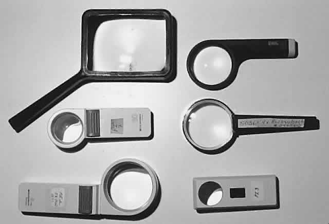Visually impaired patients sometimes have problems with high plus spectacle lenses in that spherical aberrations may be created unless aspheric lenses are prescribed. Another problem is difficulty in providing illumination on the reading material because the eye is positioned closer to the page. Patients must learn to hold reading material at the proper distance and, as discussed earlier, this is usually not so difficult with younger as with older patients. Lens magnifications are rated. An arbitrary reference to lens magnification states that a + 4.00 D reading lens has 1× magnification and a + 8.00 D lens has 2× magnification. This general formula states the magnification equals the number of D divided by four. Therefore, a + 16.00 D lens would have 4× magnification. This formula, however, is not accurate because it is based on the assumption that the average reading distance is 25 cm. These calculations do provide a reference value for understanding how the optic manufacturers correlate dioptric and magnification units. HANDHELD AND STAND MAGNIFIERS Handheld and stand magnifiers are nonspectacle magnifiers. These are often very helpful to patients who have near vision problems. These convex lenses may be designed with a handle or a stand and are portable. The advantages of handheld magnifiers are that they are easy to use when viewing eccentrically and they are most useful for short-term tasks. They are also familiar to patients and usually inexpensive. These handheld and stand magnifiers can be used along with distance and reading spectacles or the bifocal reading addition. Some disadvantages of handheld magnifiers are reduced field of view compared with that provided by spectacles and the difficulty encountered in patients who have tremors. Handheld devices must be held at the correct focal distance to obtain maximum power. Handheld magnifiers are available in a wide range of powers, size, and shape from + 3.00 D to 20× magnification. Some handheld magnifiers also have their own internal illumination source (Fig. 8). Stand magnifiers are composed of a convex lens attached to a stand that holds it at a fixed distance from the page. They are available as either fixed focus or focusable models. A virtual image is formed a short distance behind the lens (Fig. 9). Patients who use stand magnifiers must supply some accommodation or wear convex lenses to focus the emerging divergent light rays. The advantage of this type of magnifier is that this lens is stable because it is resting on a surface, and the object is always in focus because the object-lens distance is thereby fixed. The disadvantages of this system, as is the situation with handheld magnifiers, are that the field of vision is small and it is difficult to use unless the surfaces are flat. The lens in the focusable stand magnifier is adjustable.