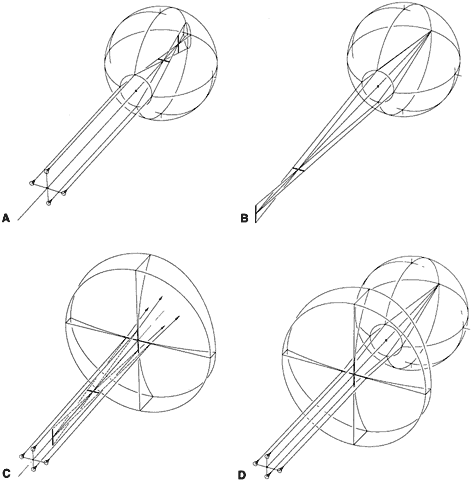 on the retina. An analogous situation occurs for the uncorrected hyperope (Fig. 2). When the patient views a distant object without accommodating, the image falls behind the retina. Placing an image on the retina requires convergent light, a situation that cannot be achieved by moving the object, but only with a lens in front of the cornea or with accommodation. A convergent (plus power) lens placed in front of the eye converges the parallel light rays. This convergent light incident on the cornea is further converged by the cornea and lens to form a retinal image. Unlike the situation of the myope, the far point in the hyperope is a point behind the retina. A convex lens or accommodation converges the light from the distant object toward the far point so that the final image is formed by the eye on the retina. Young hyperopes who can bring the image onto the retina by accommodating may not seek a refractive correction until they get older and begin to lose their accommodative ability or until prolonged near work causes fatigue because of the prolonged accommodation required. When a patient with astigmatism views a distant object point without accommodating, the point is imaged as two lines oriented 90 degrees apart (Fig. 3). In essence, the astigmatic eye has two different far points. (The astigmatism may be combined with either hyperopia or myopia.) Correction of the patient's refractive error now requires a lens that forms two different images, one at each of the far points. Such a lens has two different powers and is termed a spherocylinder, or toric, lens to distinguish it from a spherical, or sphere, lens, which corrects only myopia or hyperopia. With the proper spherocylinder lens in position, the distant point object can be focused as a single point image on the retina. |