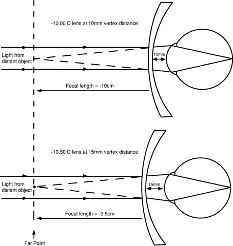 the prescribed lens and the refraction will then be the same. If the spectacle lens prescribed for the patient is not positioned at the same vertex distance as that of the refracting lens, then the spectacle lens no longer corrects the patient's refractive error properly. The error in position of the back focal point relative to the patient's far point is equal to the error in vertex distance. A lens that has effectively the same power as that of the lens used in the refraction must be prescribed; that is, the prescribed lens must have a different power so that its back focal point once again coincides with the patient's far point. The new effective power or “effectivity” can be calculated as follows: (1) effective power = 1(fV + d) where fV is the back vertex focal length of the refracting lens and d is the difference in vertex distance of the two lenses, with both distances measured in meters. If the spectacle lens is fitted forward of the position of the refractor lens (at a longer vertex distance than that of the refractor lens), then d is positive. If the spectacle lens is closer to the eye than the refractor lens, d is negative. Figure 5 provides an example. A refraction has been performed on a patient, and a power of -10.00 D is found with the refractor at a vertex distance of 10 mm. This lens has a back vertex focal length of -10 cm, so the patient's far point is 10 cm in front of the lens back surface. If the patient will be wearing spectacles that position the lens at a vertex distance of 15 mm, the distance, d, is + 5 mm, and the spectacle lens power needed is 1/(-0.10 + 0.005), or -10.53 D (-10.50 D when rounded to the nearest 0.25 D). A simple rule of thumb can be used to determine whether a vertex distance change is sufficient to require a change in the power of the lens ordered for a patient. The change in effectivity, or the change in lens power needed, is approximately equal to: (2) effectivity change = d × D2 where d is measured in meters and D is the lens power in diopters. Table 1 shows the results of this calculation for a displacement value (d) of 5 mm. Effective power changes are not significant for lower-power lenses. It is only for higher-power lenses and larger changes in lens position that the clinician must take effectivity changes into account.