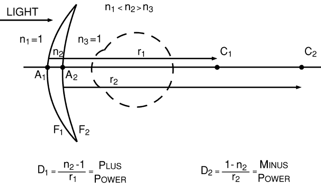 is given by: (3) D = (n2- n1)r where D is the surface power in diopters, n1 is the index of refraction of the medium containing the incident light, n2 is the index of the medium containing the refracted light, and r is the radius of curvature of the surface, specified as the distance from the surface to its center of curvature, measured in meters. A sign convention similar to that used for focal lengths must be used for radii, and an example is shown in Figure 6. With light traveling from left to right, the distances ÜobA1C1 and ÜobA2C2 are both positive. The index of the lens is always greater than 1, so the front surface power (D1) is positive and the back surface power (D2) is negative, the typical surface power relationship for most spectacle lenses. |