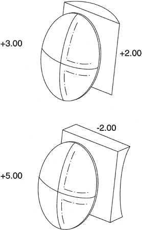 PRESCRIPTION NOTATION AND DESIGN OF SPHEROCYLINDER LENSES When astigmatic corrections were first used, the corrective lenses were fabricated by cementing a second nonspherical lens onto one of spherical power. These cemented-on lenses were “slices” of a cylinder (Fig. 11). If used alone, a cylinder lens focuses light in only one meridian because the power is in only one principal meridian (the power meridian), the other having 0 or plano power (the axis meridian). The power meridian and cylinder axis are 90 degrees to each other. If a patient needed a + 3.00-D correction in the vertical direction and a + 5.00-D correction in the horizontal, a + 2.00-D cylinder with its axis at 90 degrees could be cemented onto the flat back surface of a + 3.00-D spherical lens, as shown in the upper drawing of Figure 12. Thus, the finished lens had a power of + 3.00 D in the vertical and + 5.00 D in the horizontal direction. It literally was a + 3.00-D sphere combined with a + 2.00-D cylinder. This was the origin of the custom of writing a prescription for astigmatic corrections as a sphere with a cylinder, in this case plus cylinder notation (e.g., + 3.00 sphere + 2.00 cylinder axis 090, abbreviated + 3.00 + 2.00 × 090). The same lens power could have been achieved with a + 5.00-D sphere and a -2.00-D cylinder with its axis horizontal at 0 degrees (see Fig. 12, lower drawing), or as more commonly stated, 180 degrees (+ 5.00 -2.00 × 180). Astigmatic corrections were originally prescribed and fabricated with both plus and minus cylinders. The diagrams of Figure 12 illustrate the concept of what came to be known as a spherocylinder lens.